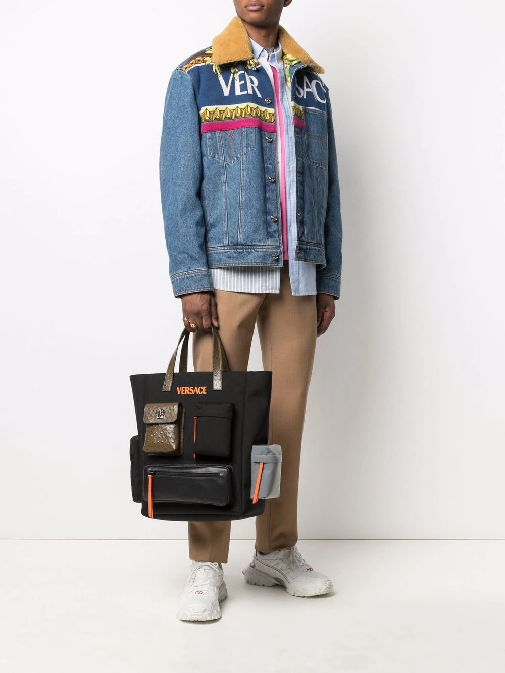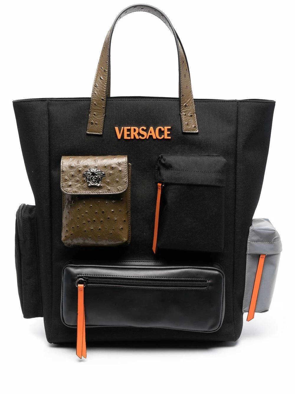 Effet cuir d’autruche, motif Medusa, design colour block, poches multiples zippées, compartiment principal, anses sur le dessus. Couleur : noir. Matière : cuir de veau.