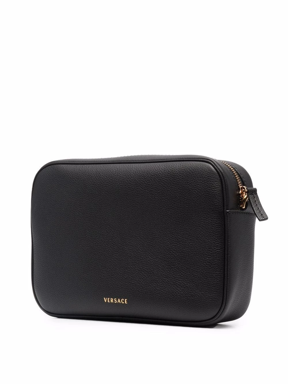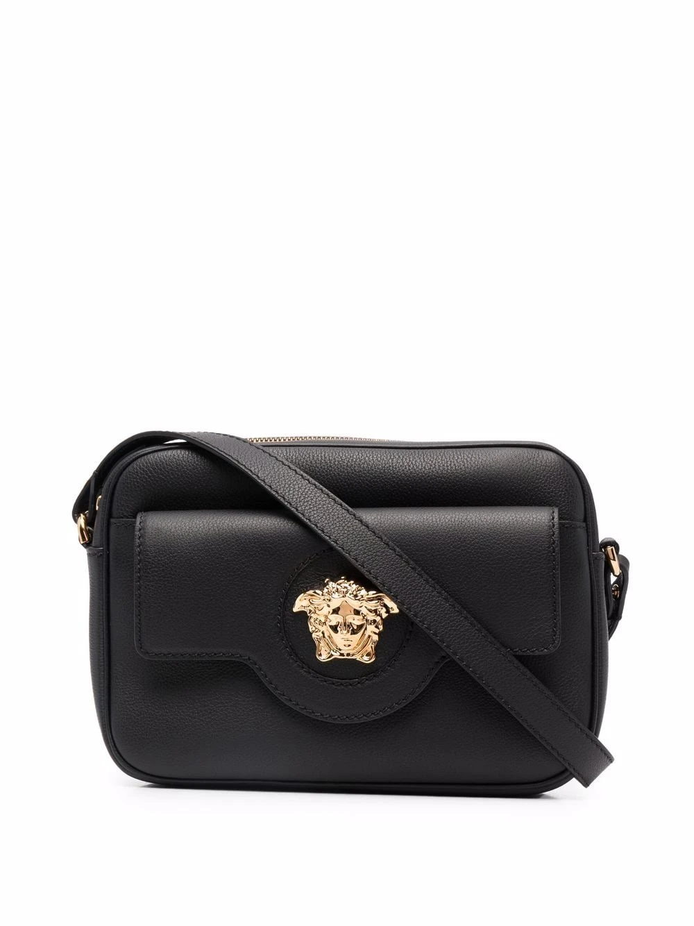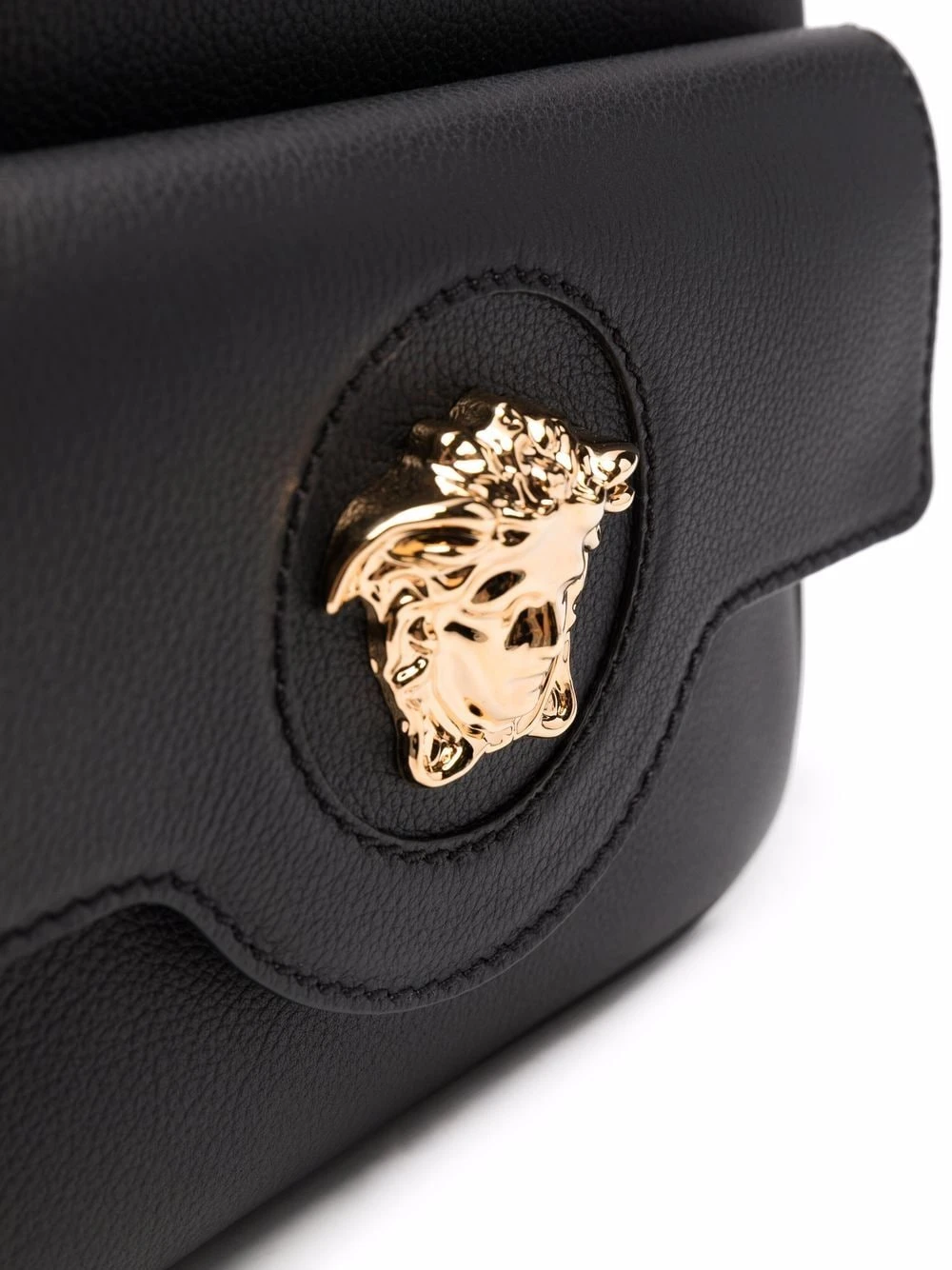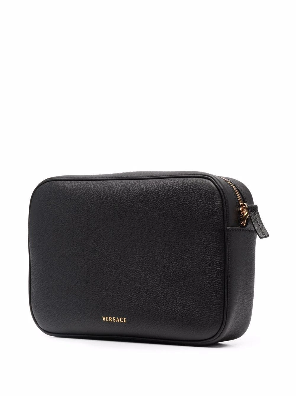 Détail Medusa, logo embossé sur le devant, forme rectangulaire, rabat sur le dessus, fermeture zippée sur le dessus, bride porté épaule ajustable. Couleur : noir.