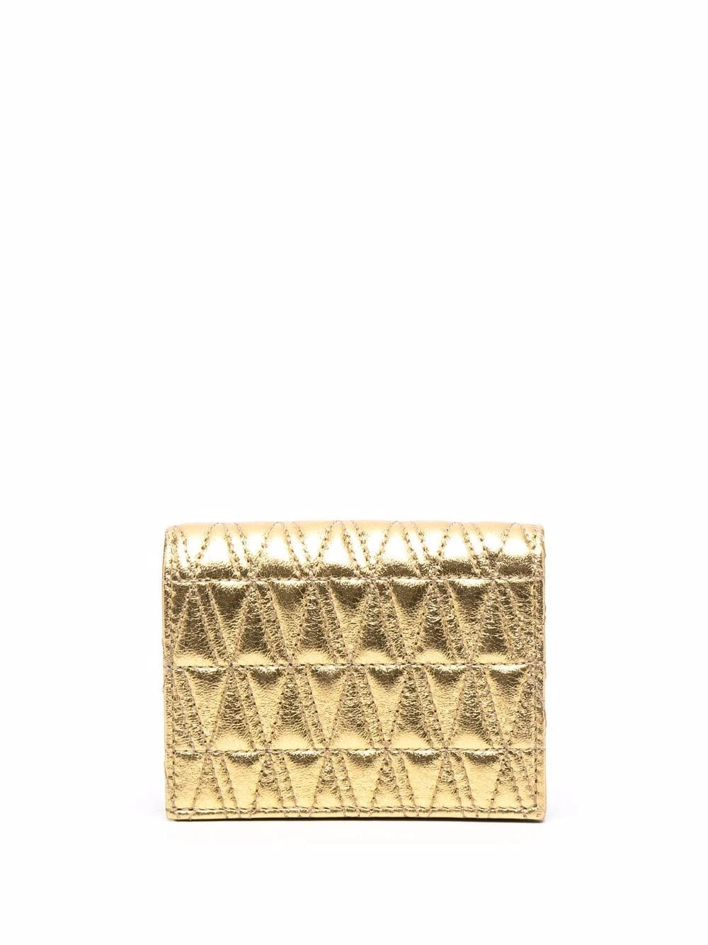Détail de logo Virtus signature, finitions en métal doré, effet métallisé, effet matelassé, rabat sur le devant, fermeture à boutons pression, poche ticket, compartiments intérieurs pour carte. Matière : cuir de veau.