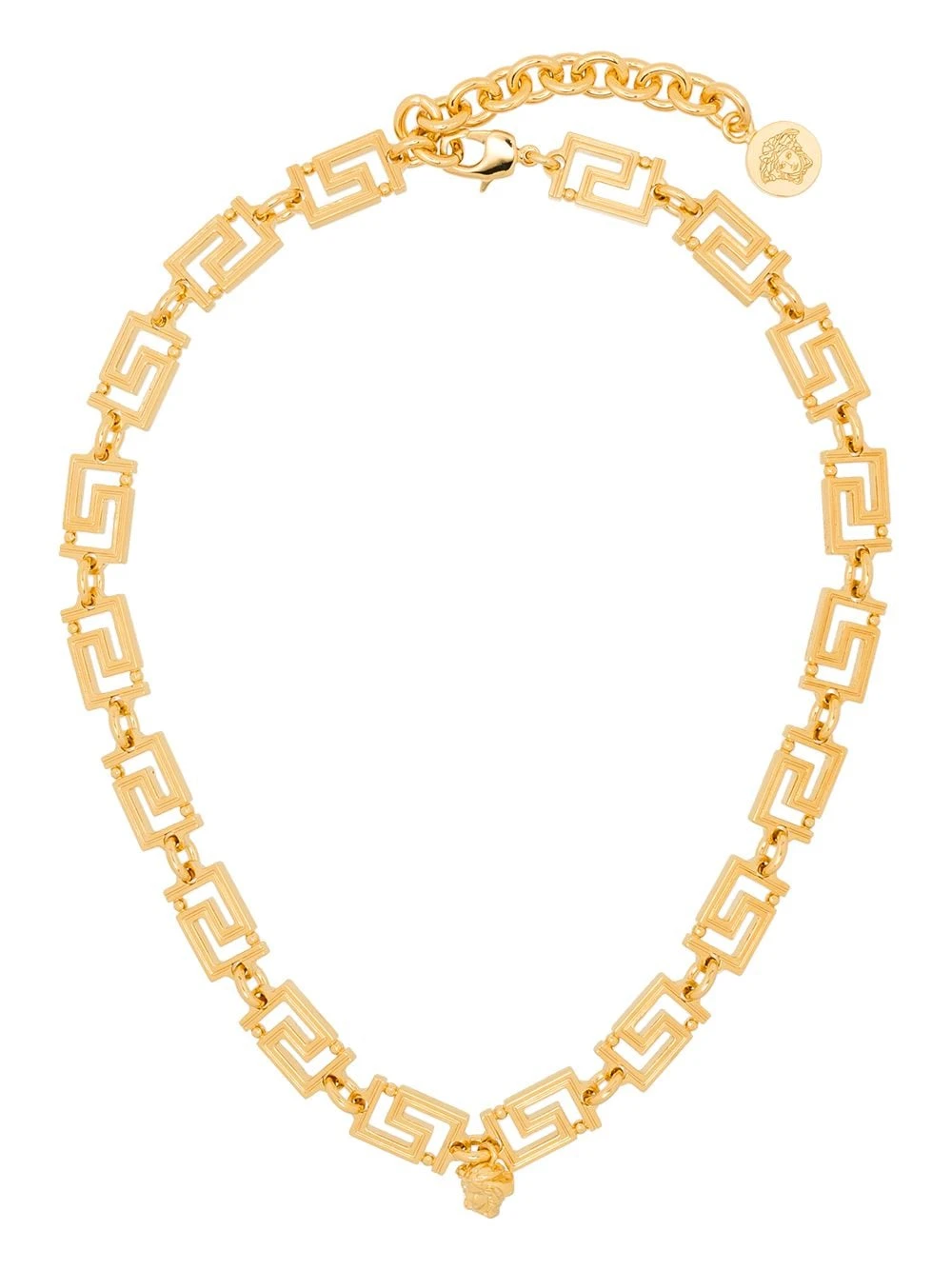 Détail Greca signature, motif Medusa, fermoir mousqueton, fini poli. Matière : laiton.