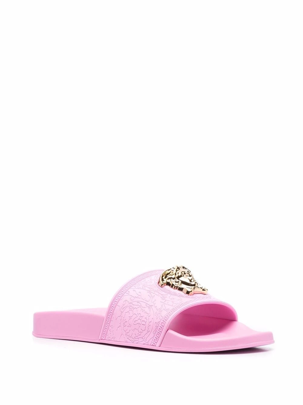 Détail Medusa, bout ouvert, semelle intérieure à logo, semelle plate en caoutchouc. Couleur : rose.
