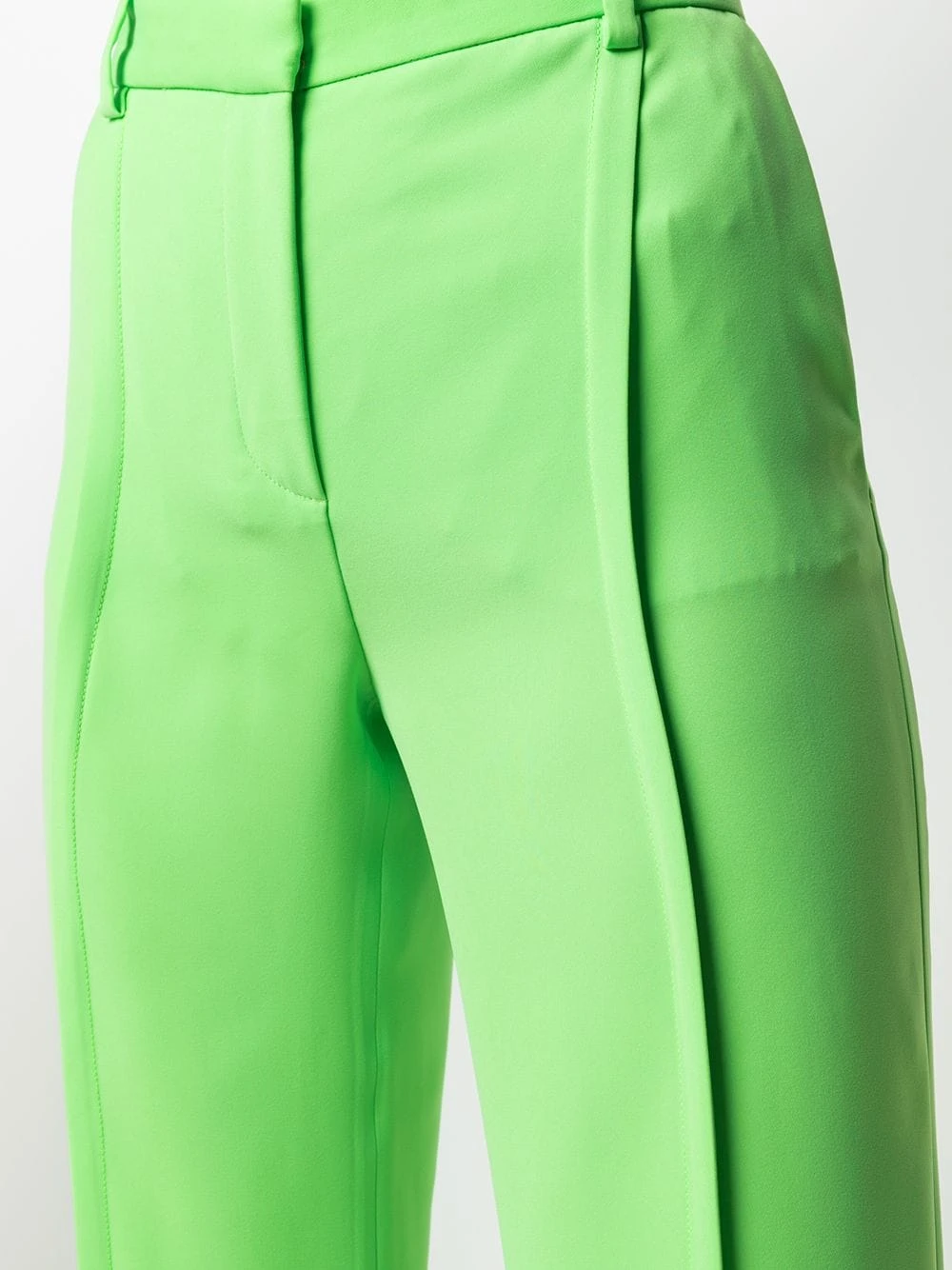 Taille haute, coupe ample, passants de ceinture, fermeture à zip et agrafes, deux poches latérales passepoilées.