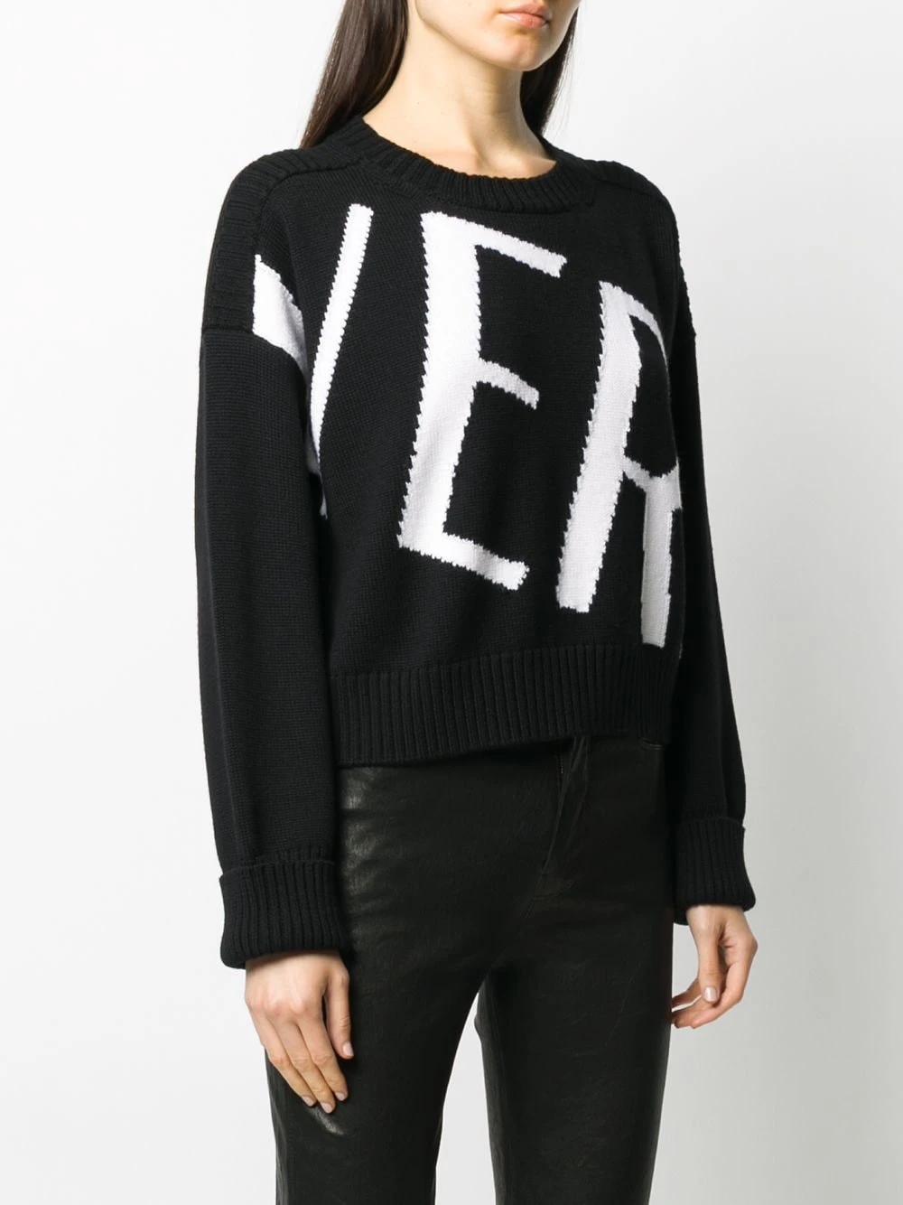 Encolure ras du cou, design tricoté, logo brodé, manches longues, poignets nervurés, coupe courte, ourlet nervuré. Matière : Laine.