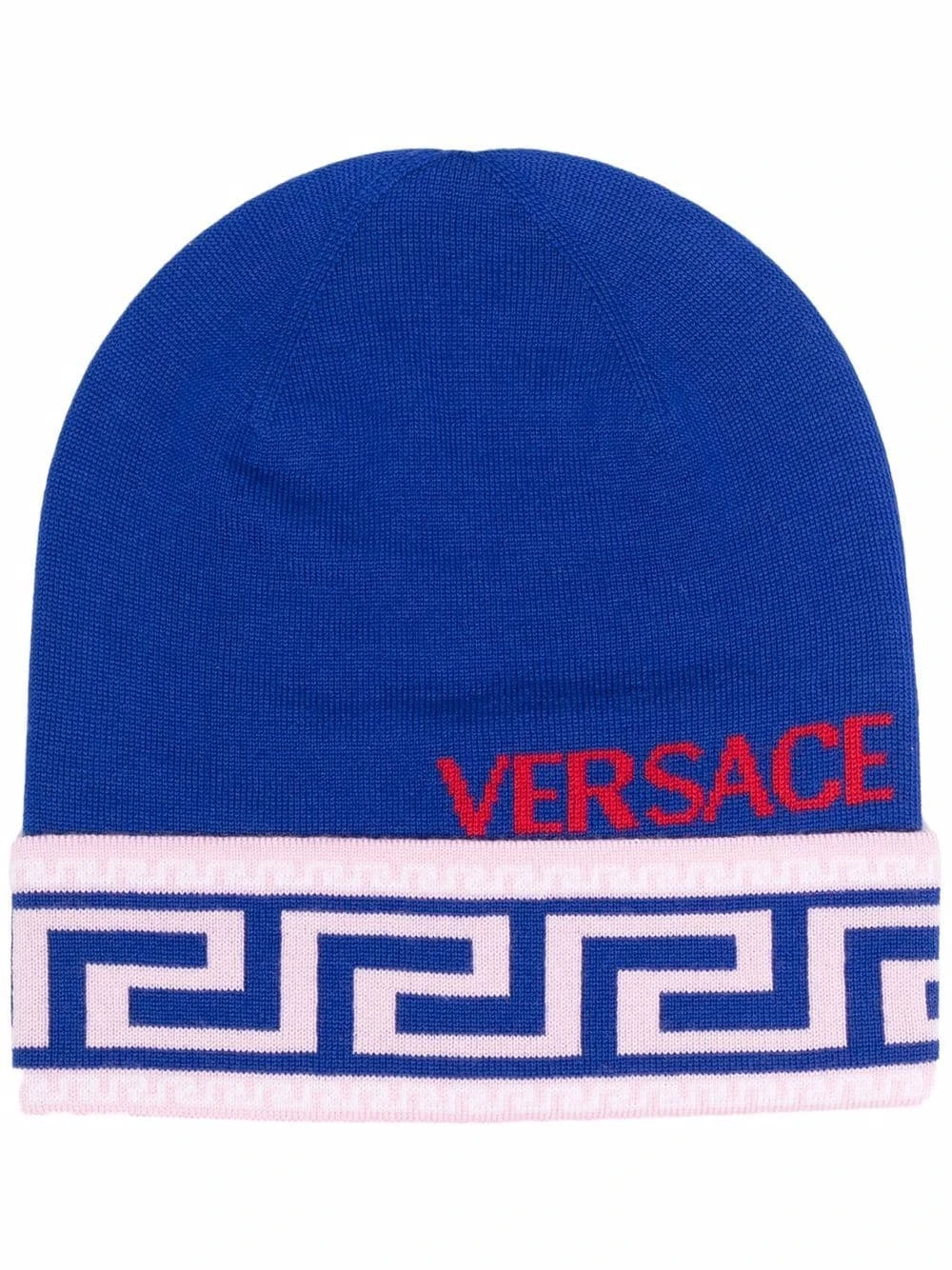 Design tricoté, design en jacquard, détail Greca signature, logo intarsia. Matière : laine.