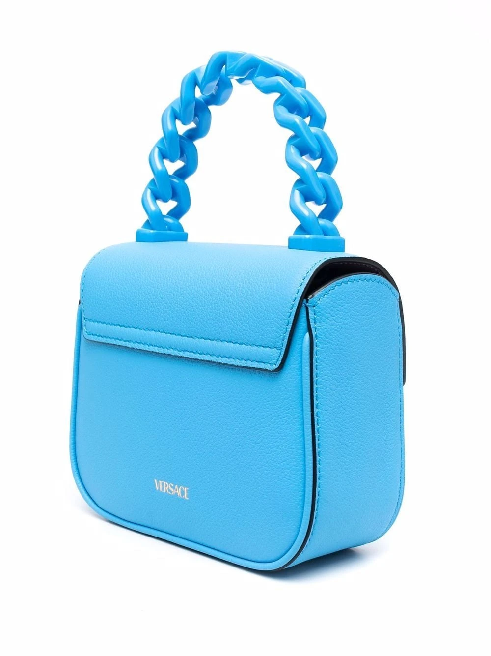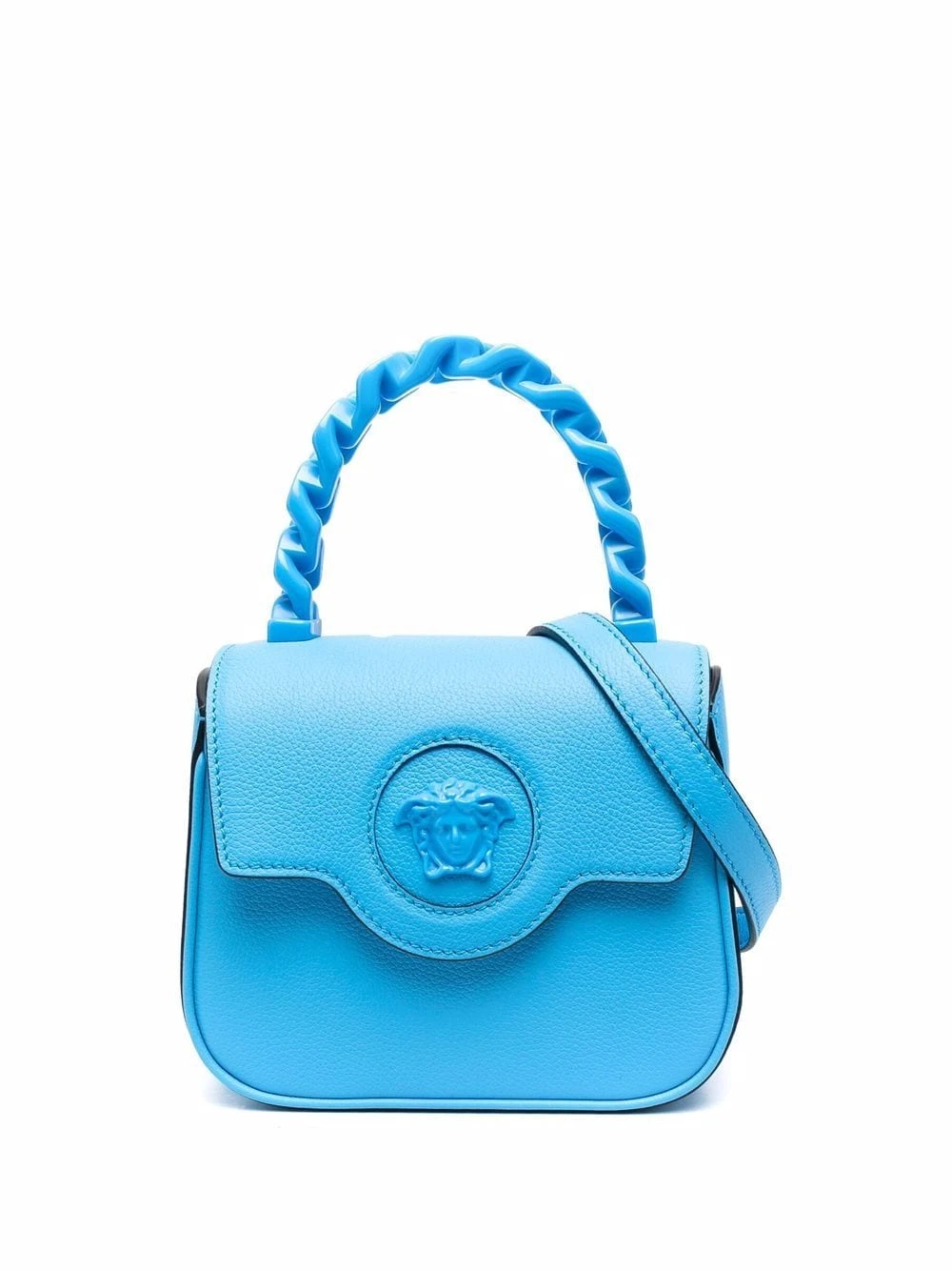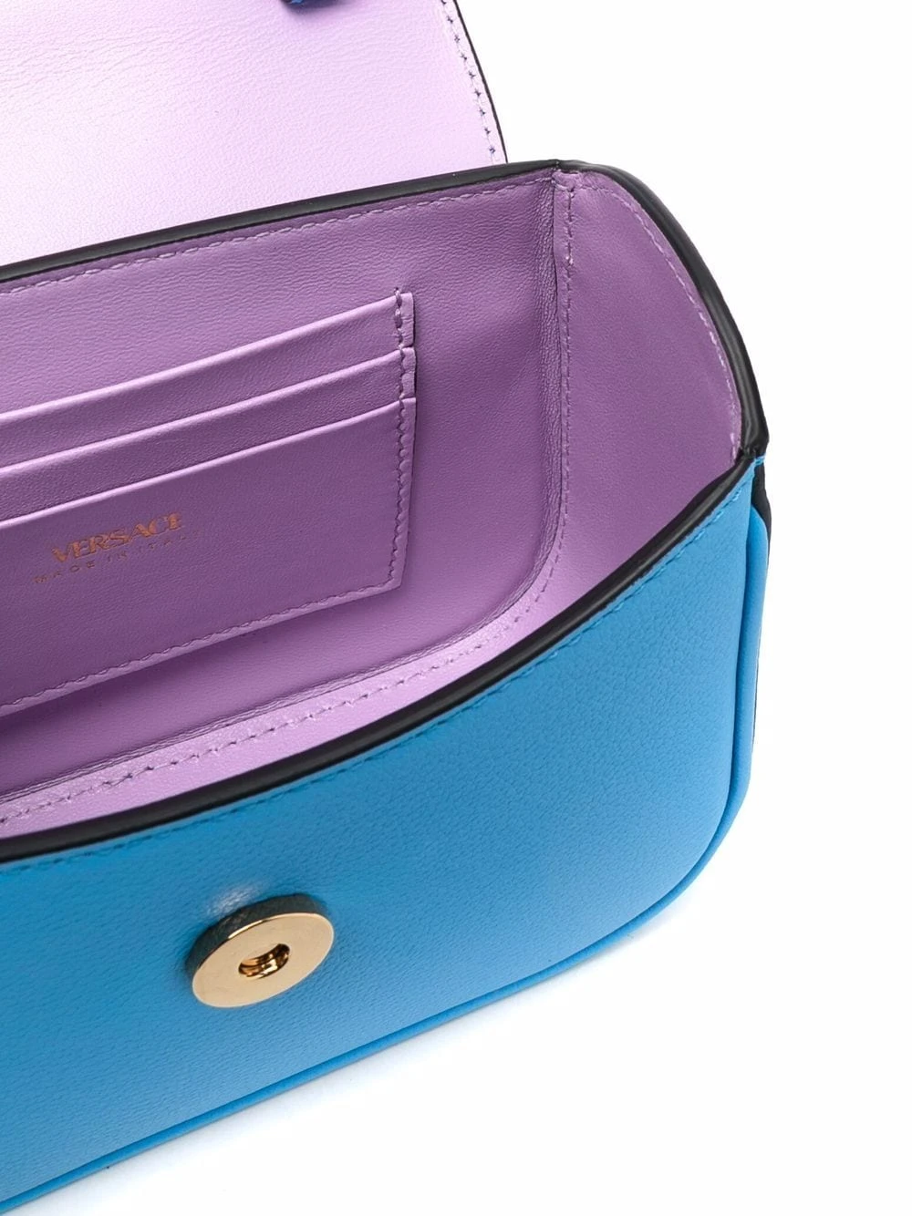 Motif Medusa, logo doré, rabat sur le dessus à fermeture magnétique, anse arrondie, compartiment principal, compartiments intérieurs pour carte, bride porté épaule détachable. Matière : cuir.