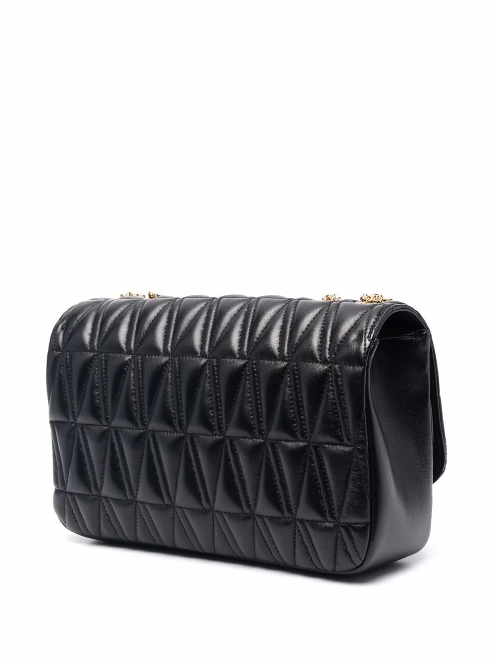 Effet matelassé, bride porté épaule en cuir et maillons de chaîne, rabat sur le dessus à fermeture magnétique, compartiment principal, compartiments intérieurs pour carte, logo imprimé à l’intérieur, finitions en métal doré. Couleur : noir. Matière : cuir.