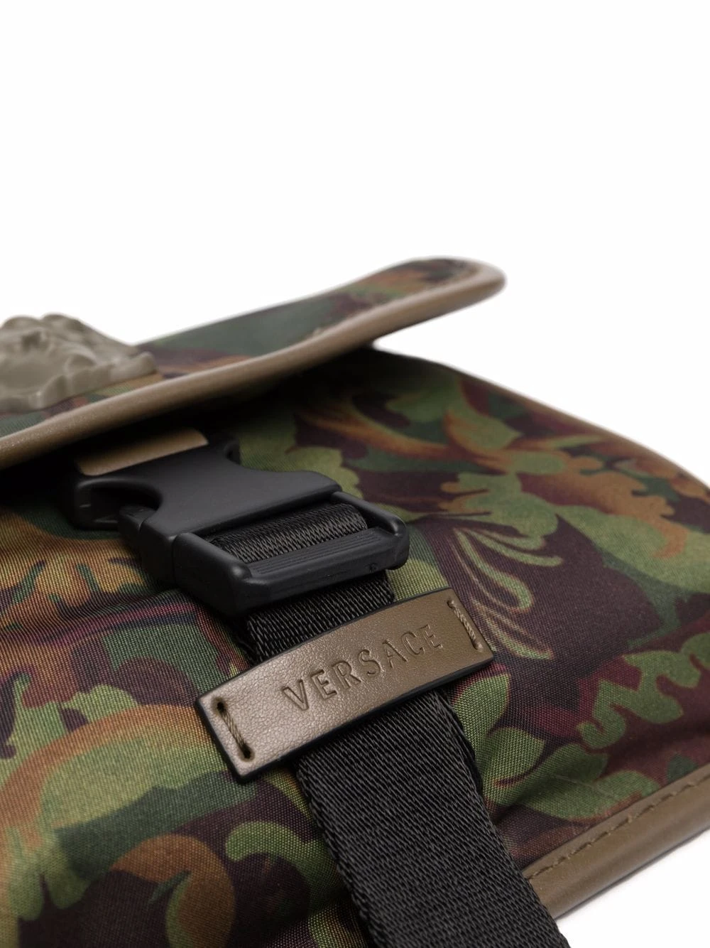 Liseré en cuir, motif Medusa, patch logo sur le devant, rabat sur le devant, fermeture à boucle sur le devant, bride porté épaule ajustable, compartiments intérieurs pour carte.