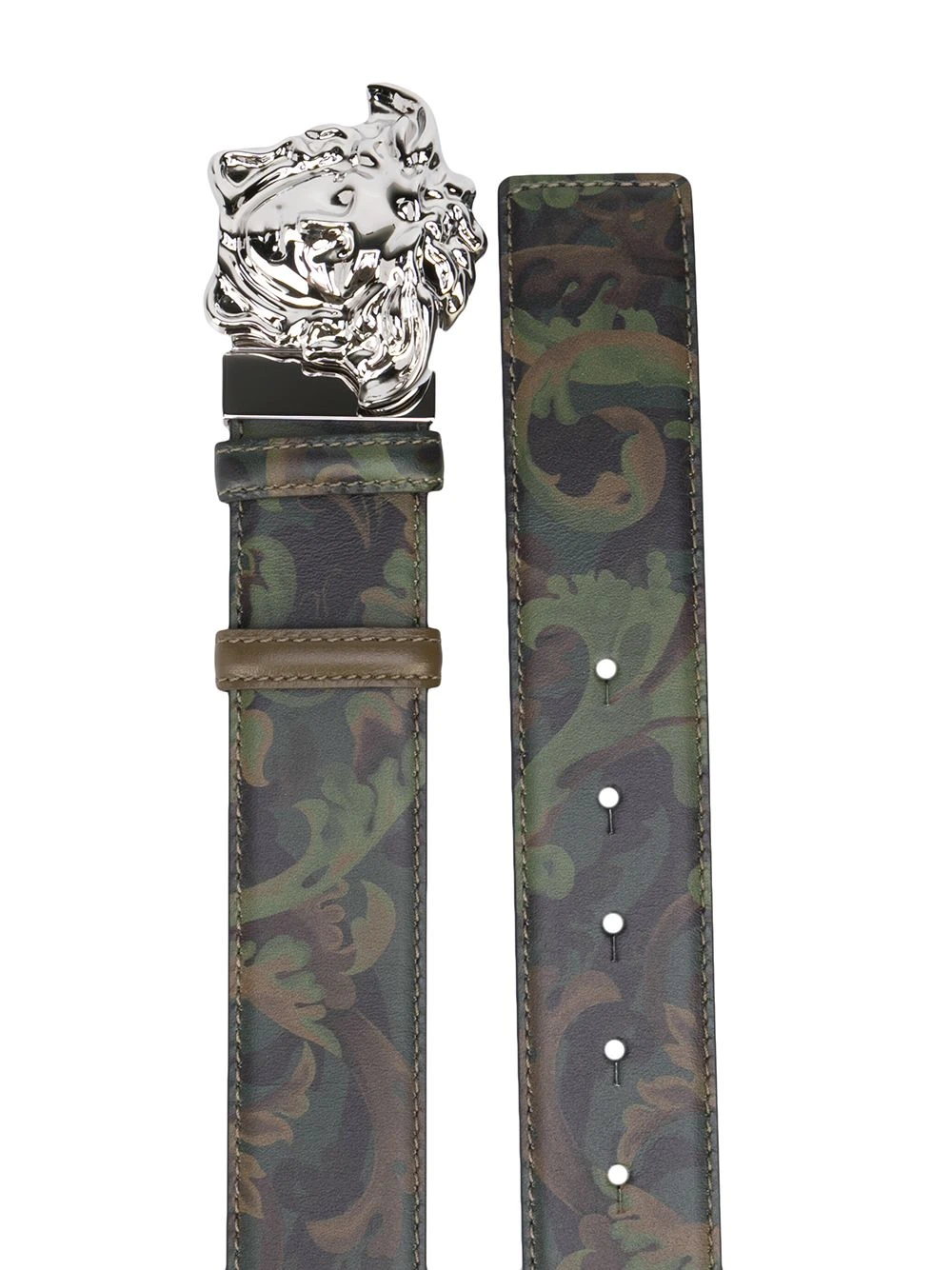 Ornements argentés, détail Medusa, imprimé Barocco signature, coutures ton sur ton, taille ajustable. Couleur : vert. Matière : cuir.