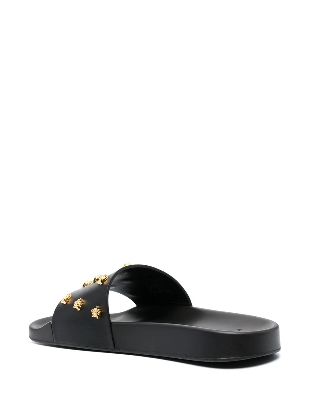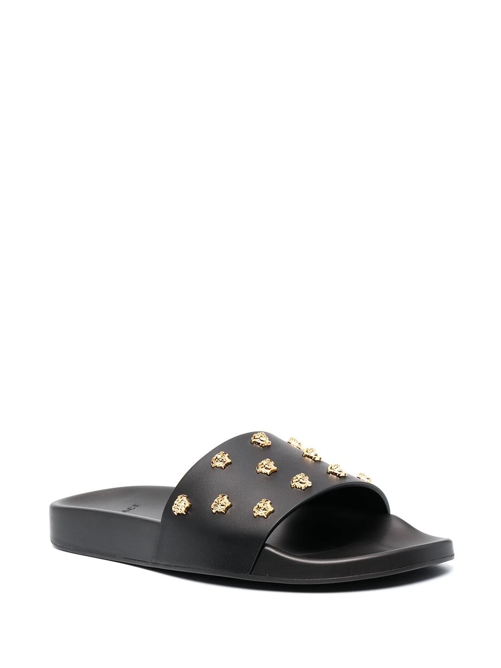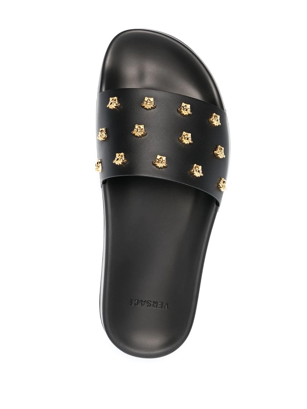 Motif Medusa, semelle intérieure à logo, bout ouvert, design à enfiler, semelle plate en caoutchouc. Couleur : noir. Matière : cuir.