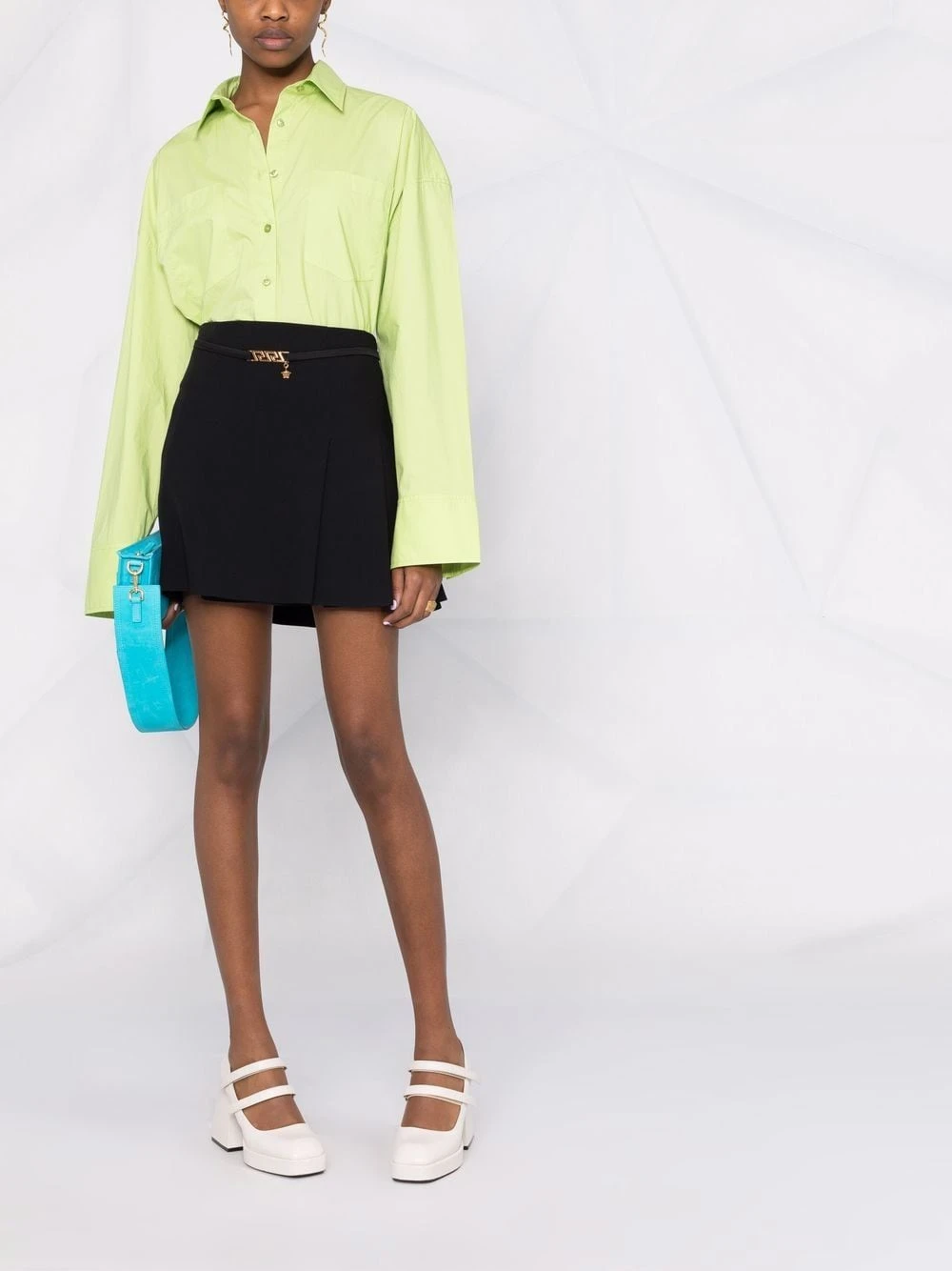 Imprimé La Greca signature, finitions en métal doré, coupe trapèze, taille haute, détails de plis, ourlet incurvé, longueur au dessus du genou. Couleur : noir.
