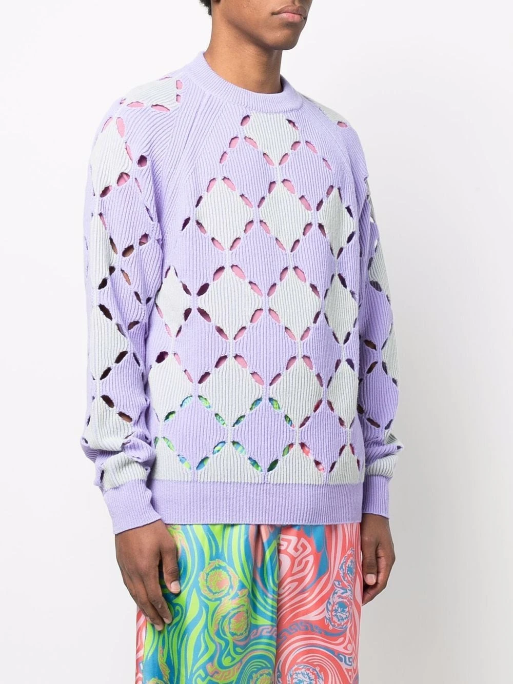 Design perforé, maille nervurée, design colour block, encolure ras du cou, manches longues, ourlet droit. Matière : laine.