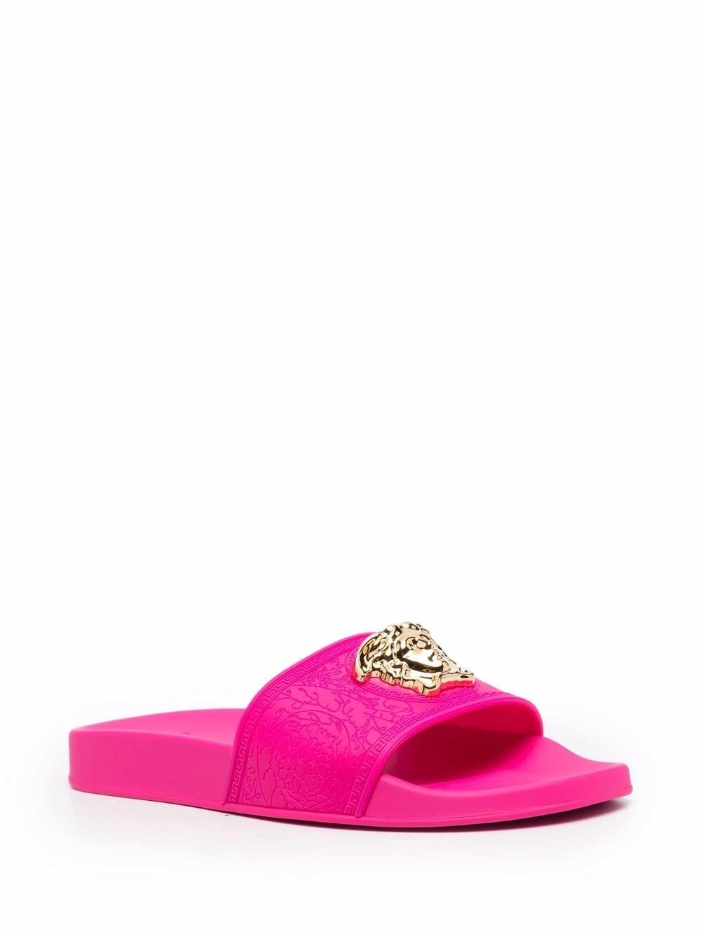 Détail Medusa, finitions en métal doré, bout ouvert, design à enfiler, semelle plate en caoutchouc. Couleur : rose. Matière : Matériaux Naturels (autre)->Caoutchouc.