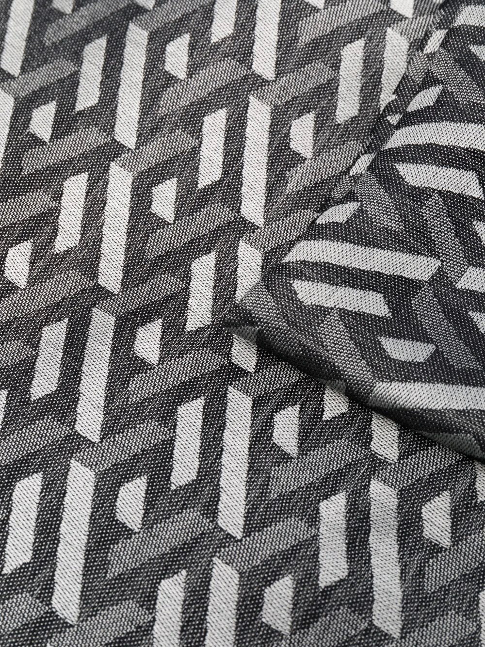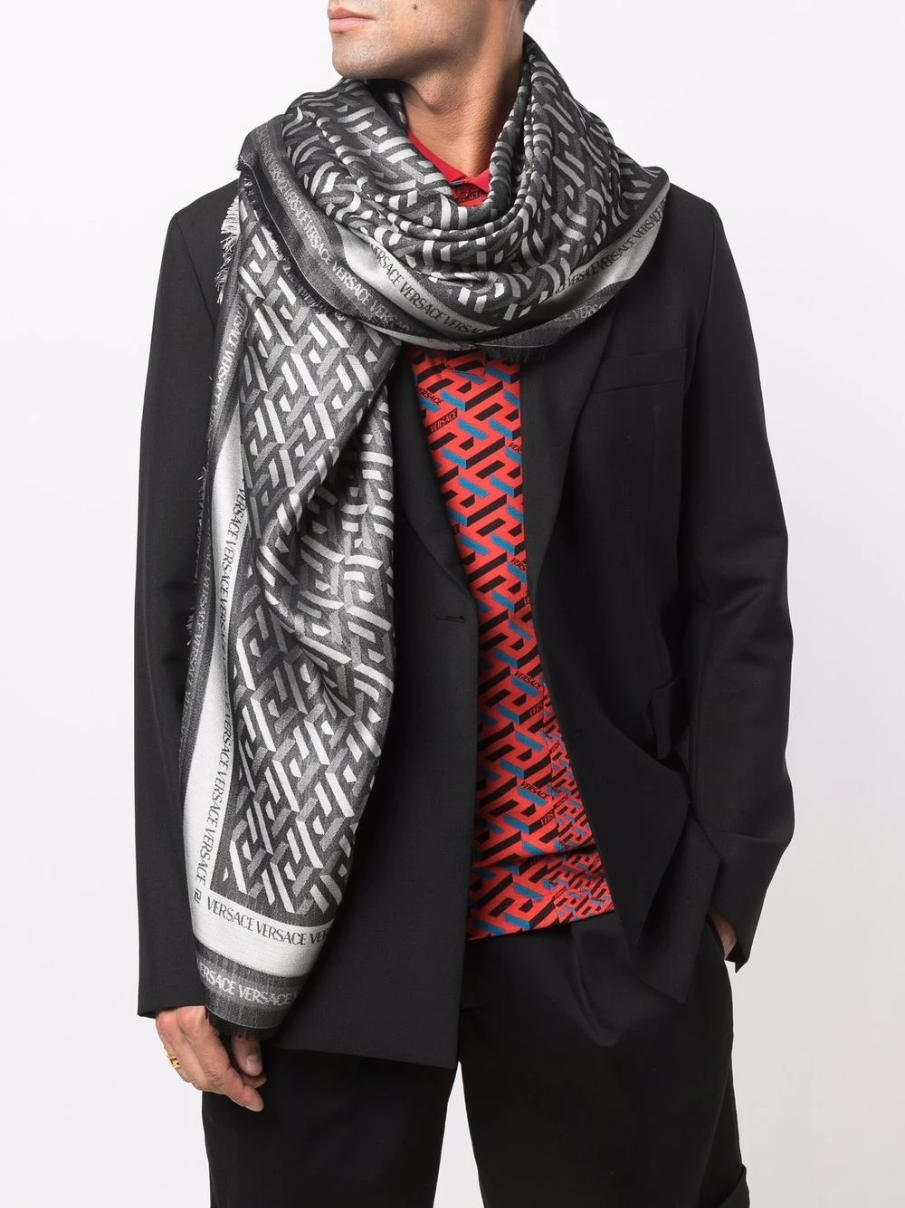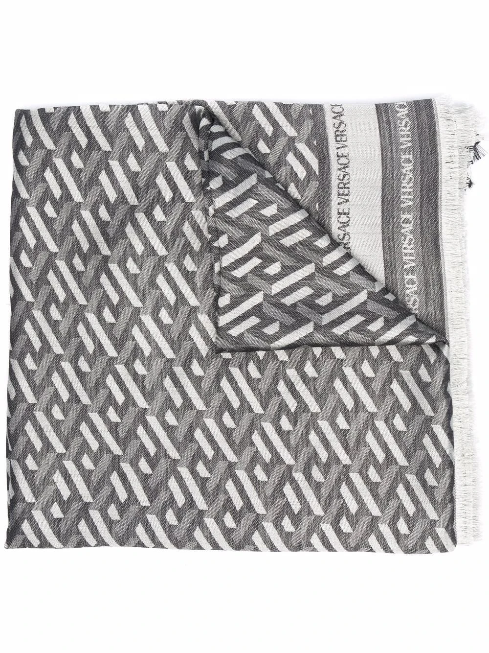 Jacquard à motifs, bordures à logo imprimé, bords frangés, structure légère.