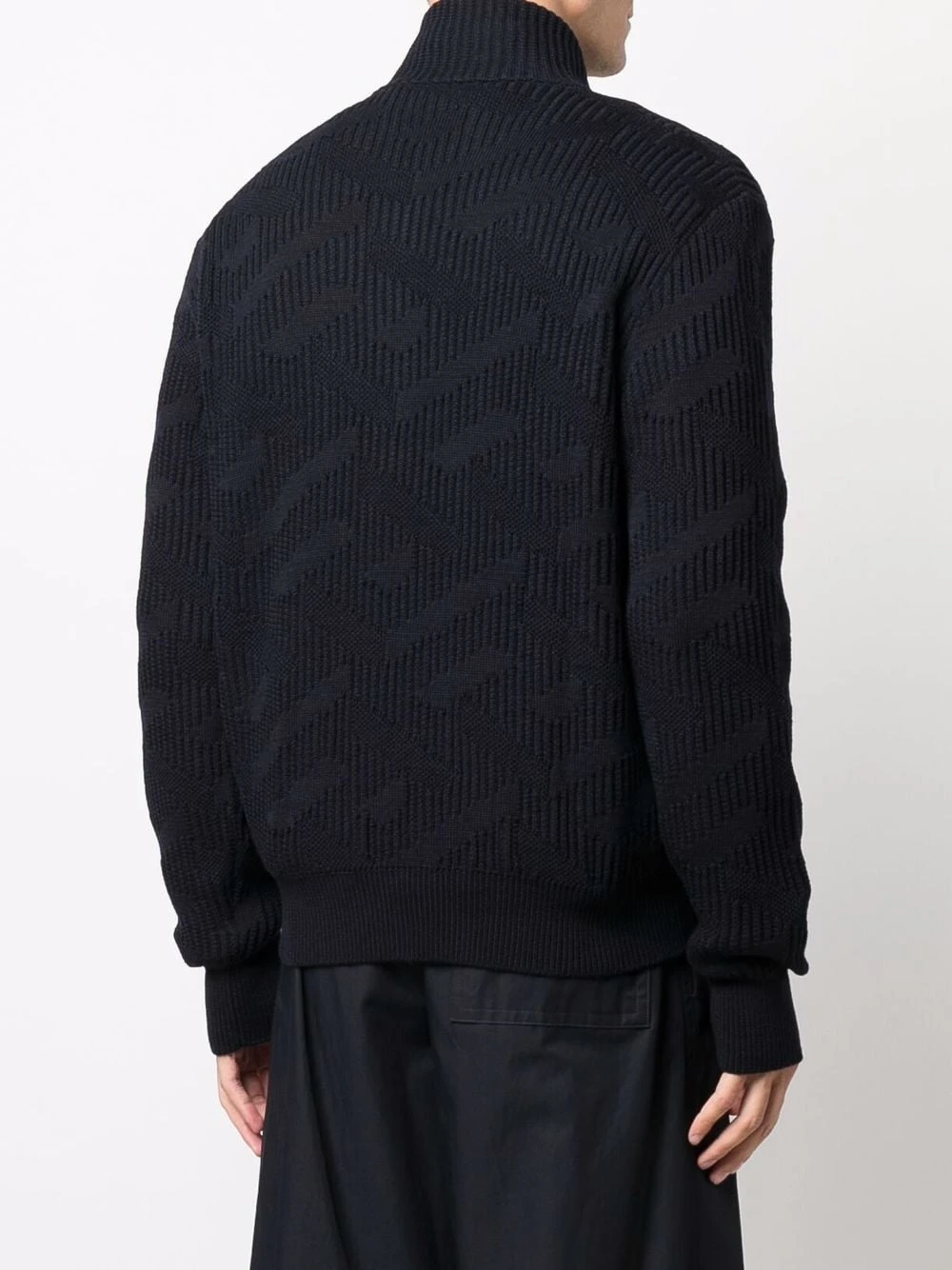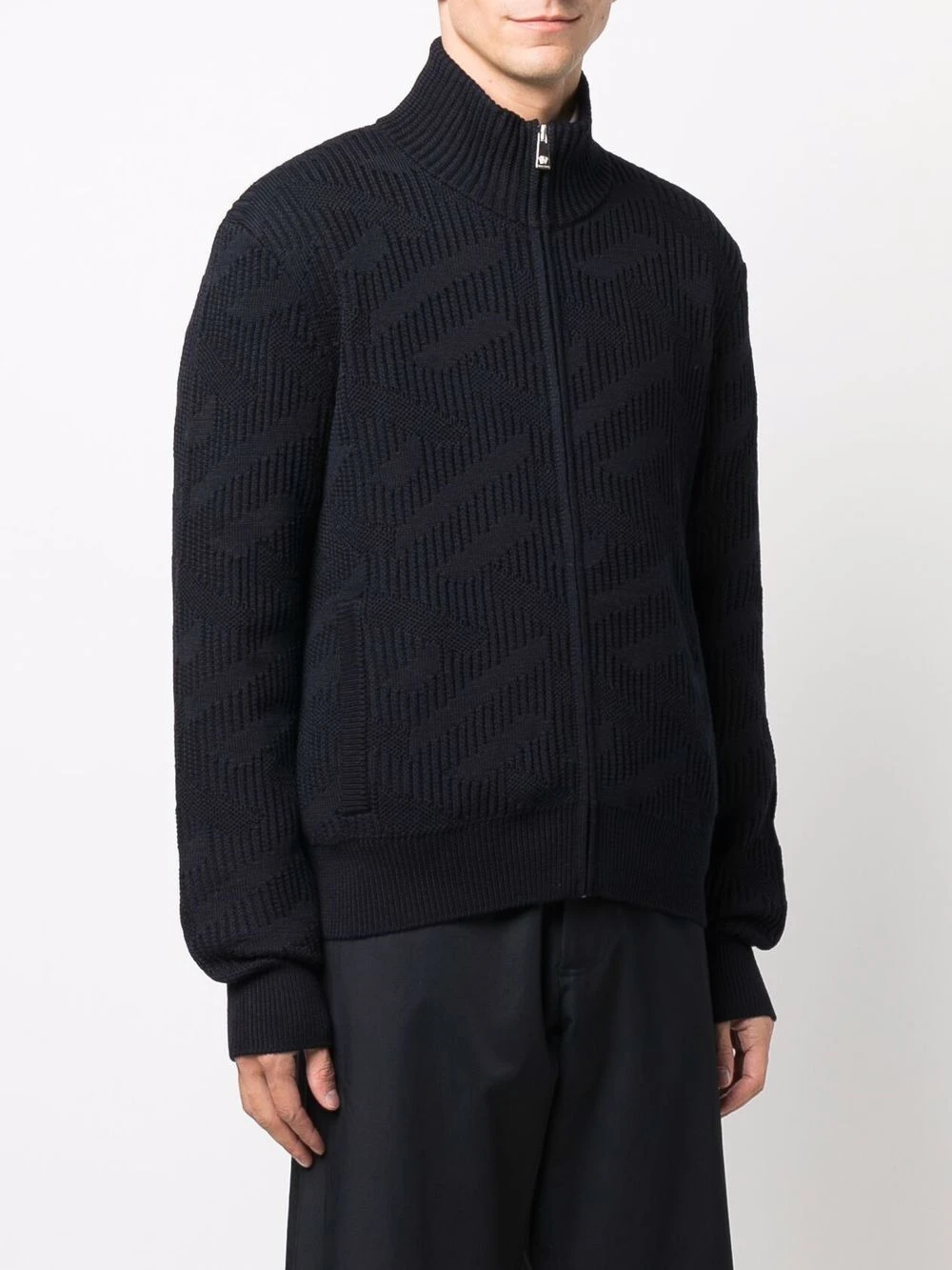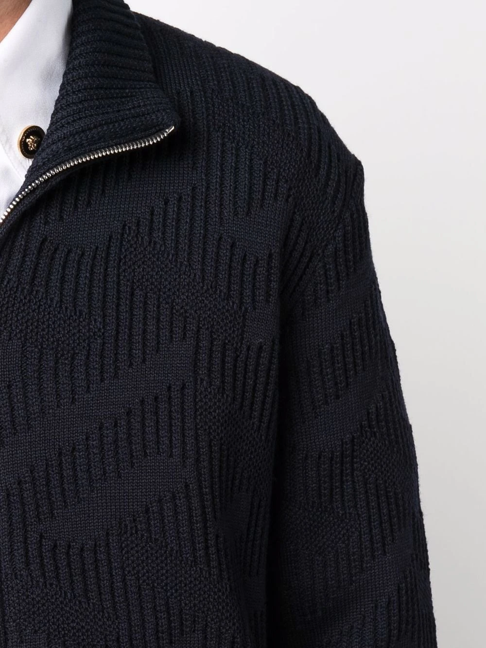Bleu, col montant, maille nervurée, fermeture zippée devant, manches longues, ourlet nervuré.
