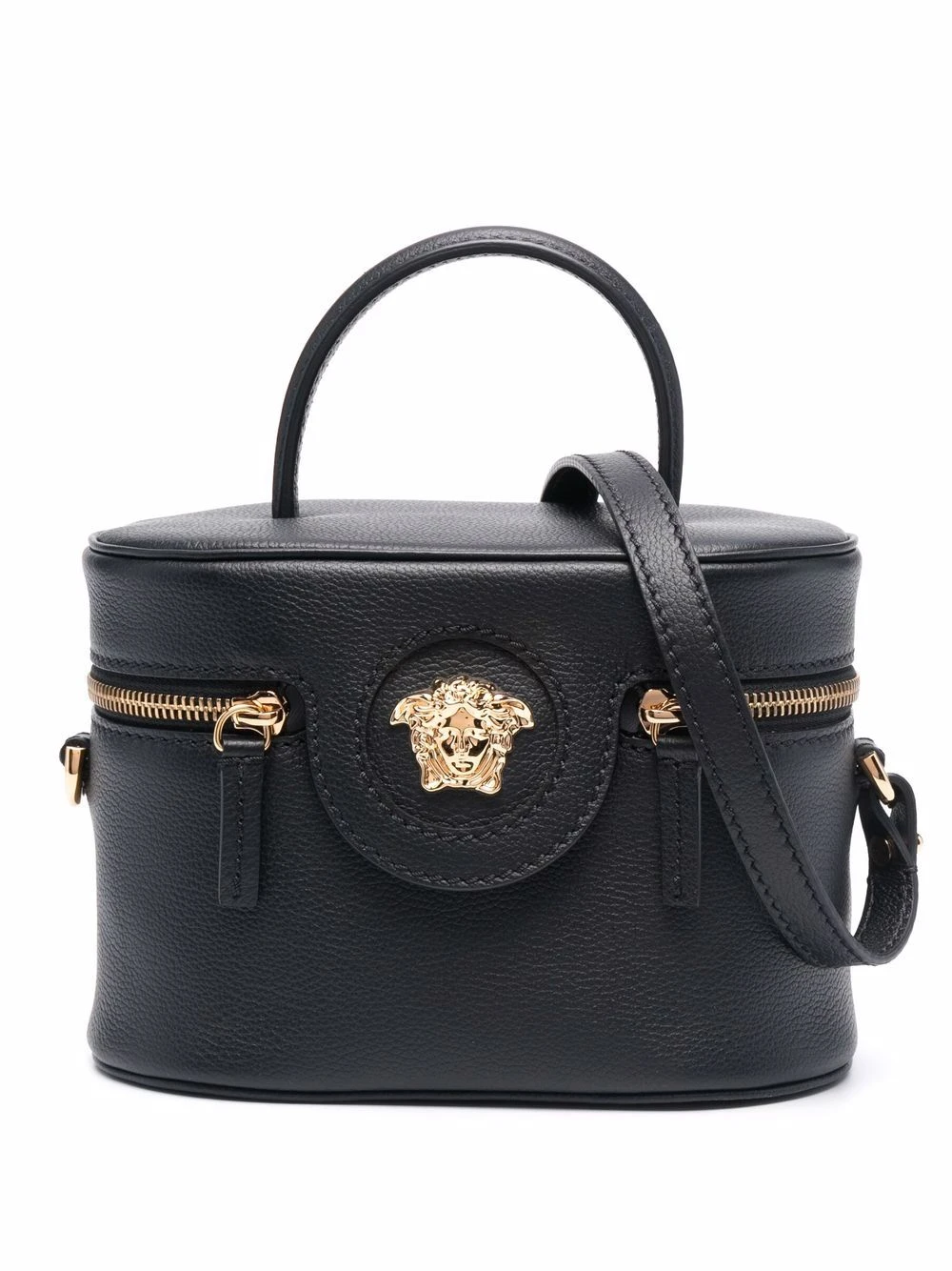 Motif Medusa, anse arrondie, bride porté épaule détachable, rabat sur le dessus à fermeture magnétique, fermeture zippée tout autour, compartiment principal, patch logo intérieur, logo imprimé à l’arrière, finitions en métal doré. Couleur : noir.
