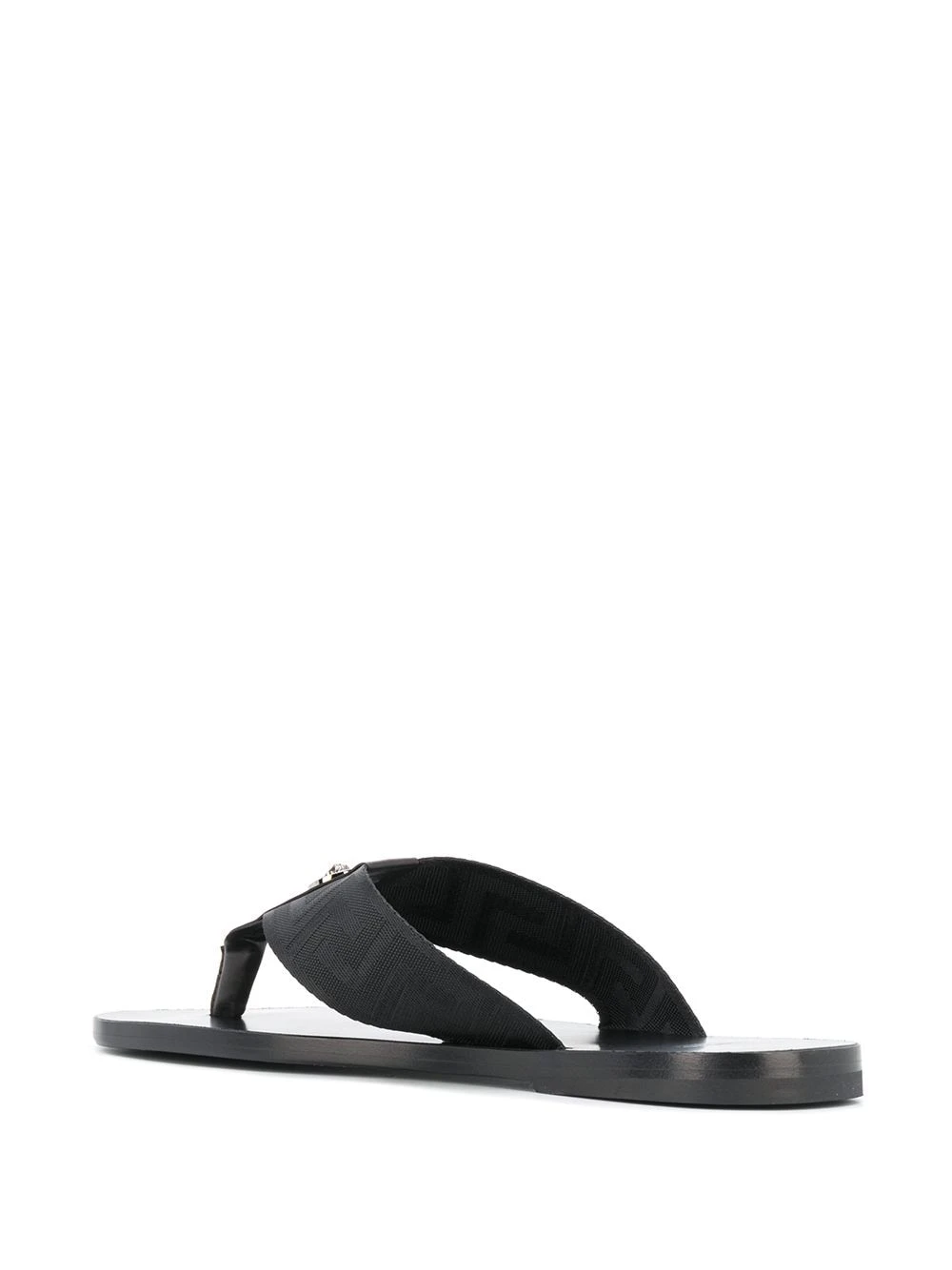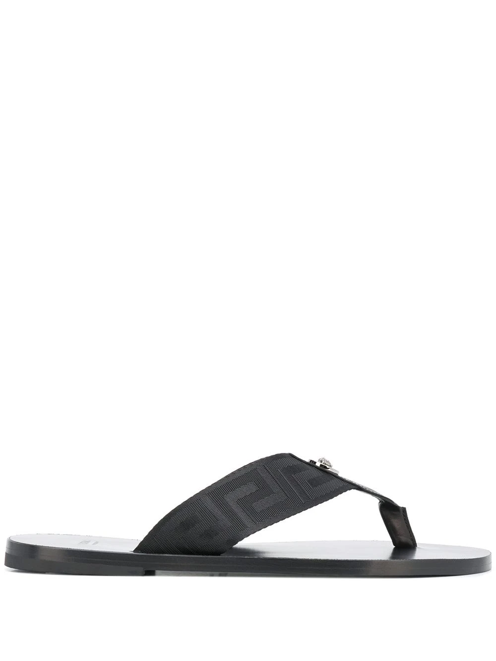 Liseré en cuir, imprimé Greek Key, détail Medusa, entre-doigts, semelle en cuir. Couleur : noir.