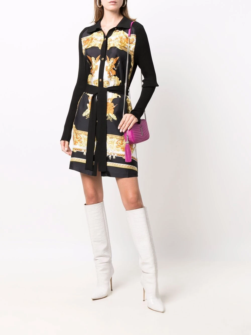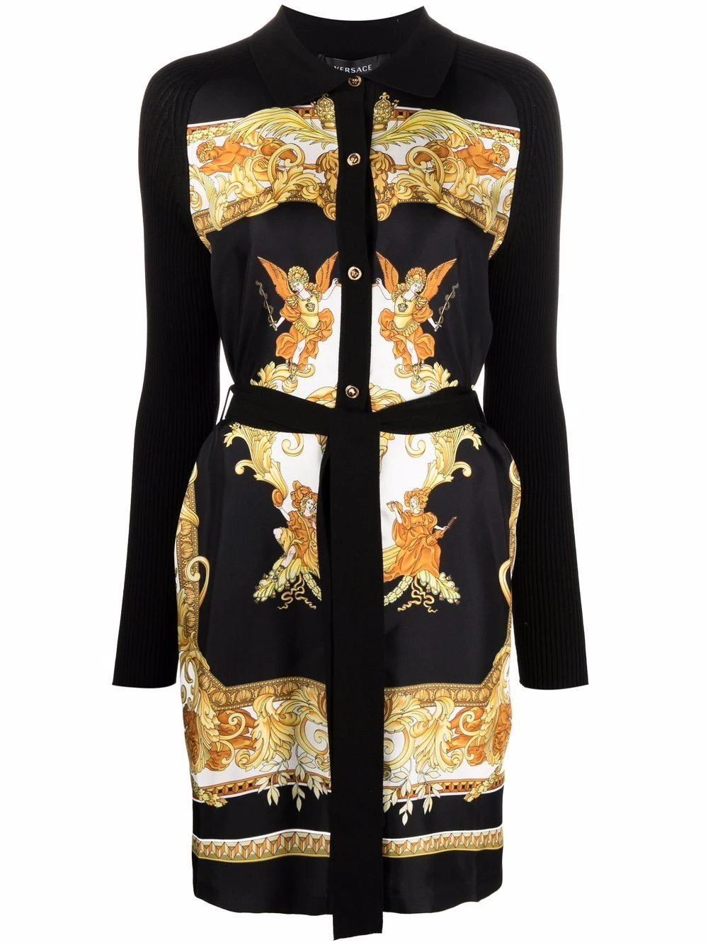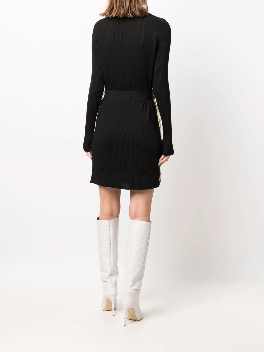 Col classique, boutonnière sur le devant, taille ceinturée, manches longues. Couleur : noir.