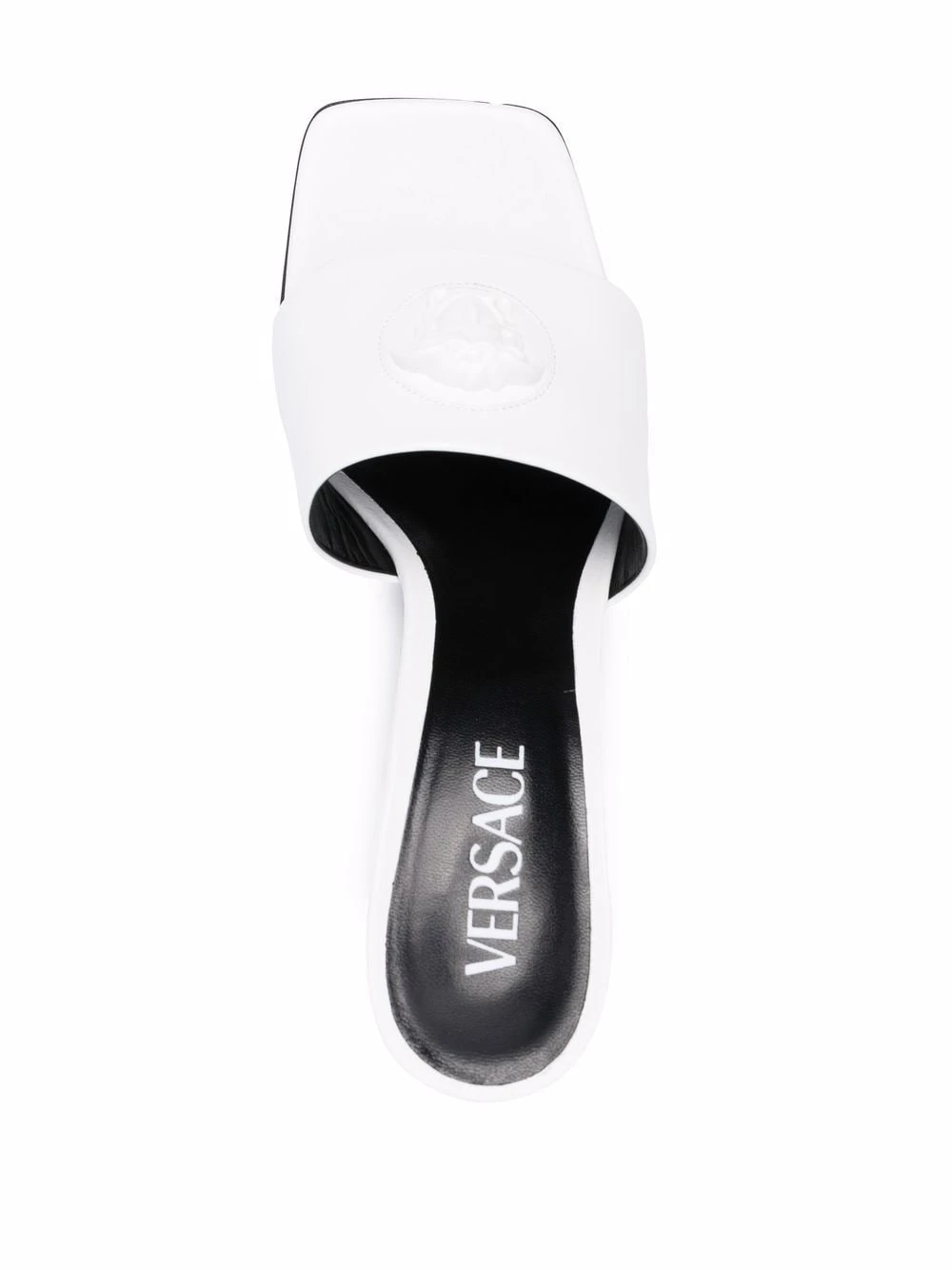 Doublure en cuir, motif Medusa, bout ouvert, bride à un doigt, semelle intérieure à logo, talon haut épais.
