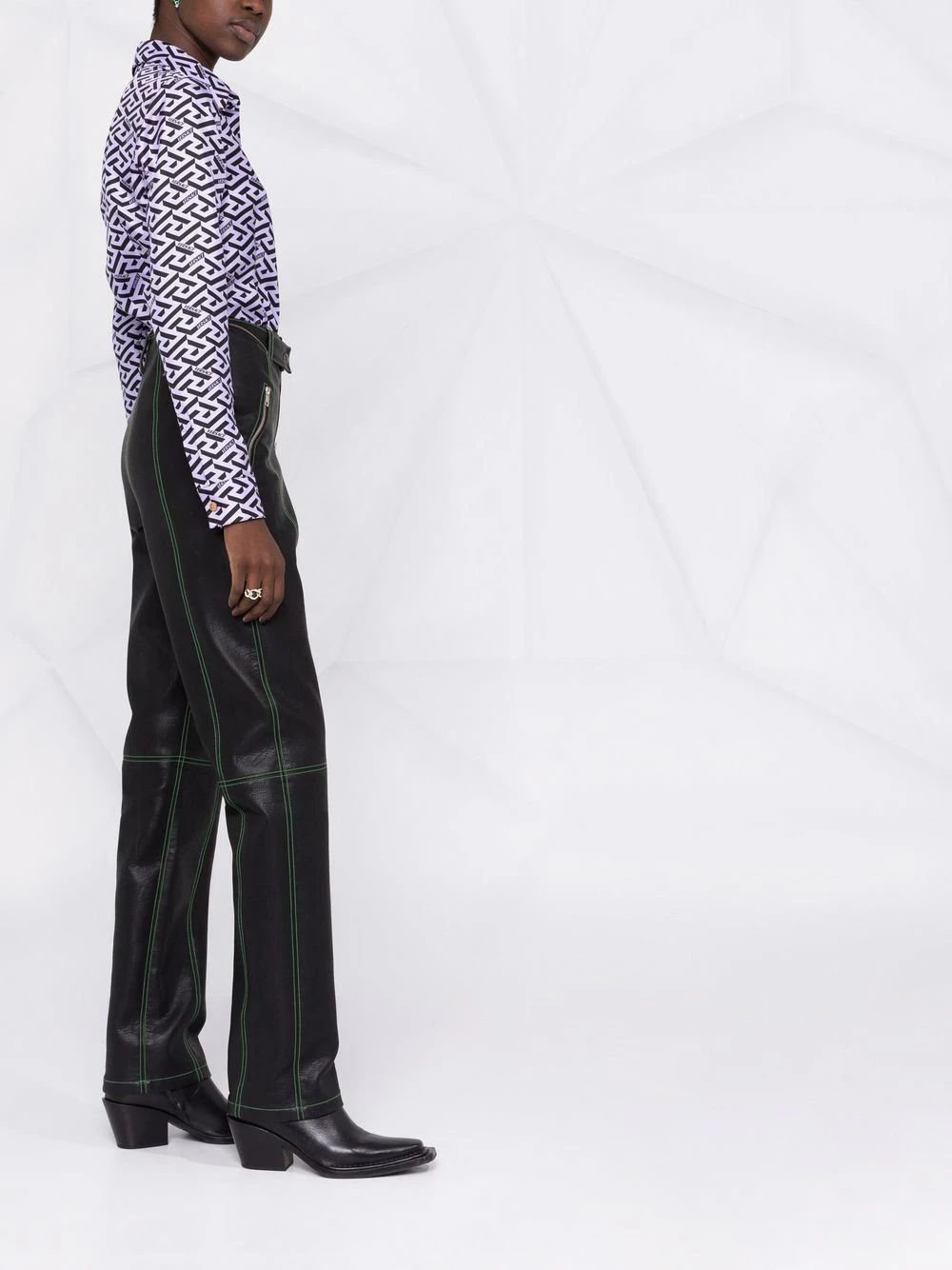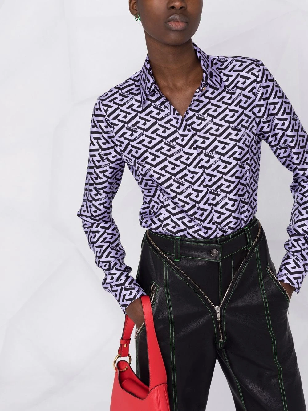 Imprimé monogrammé, col classique, fermeture dissimulée sur le devant, manches longues. Matière : soie.