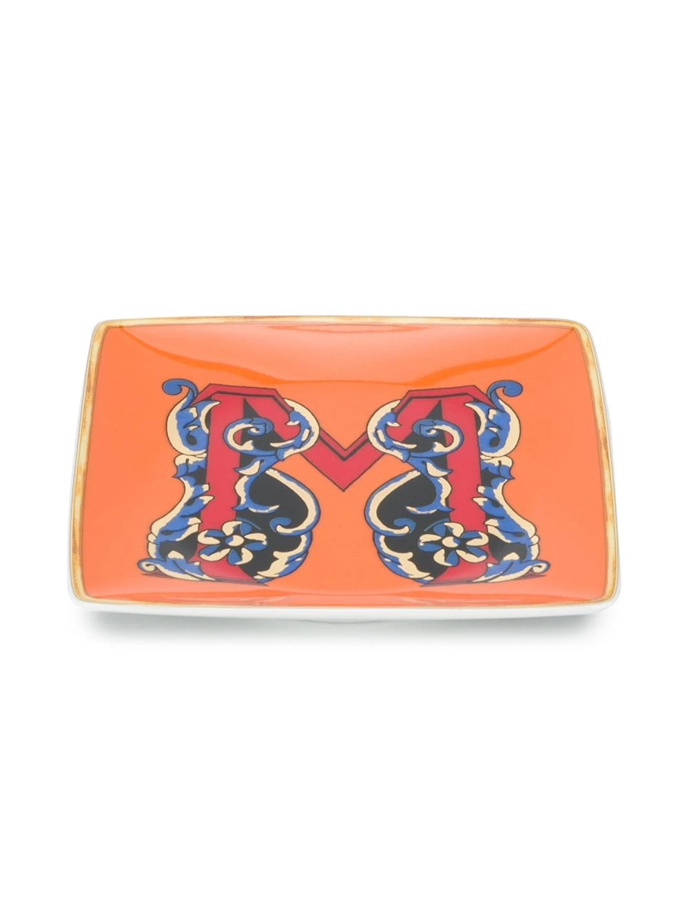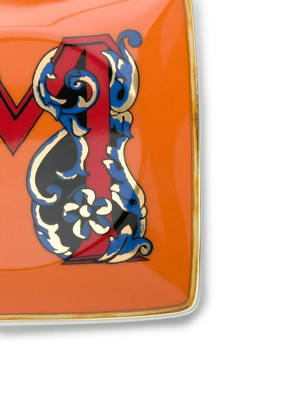 Cendrier à imprimé baroque Versace Home avec forme carrée, dessus concave et imprimé baroque. Couleur : orange.