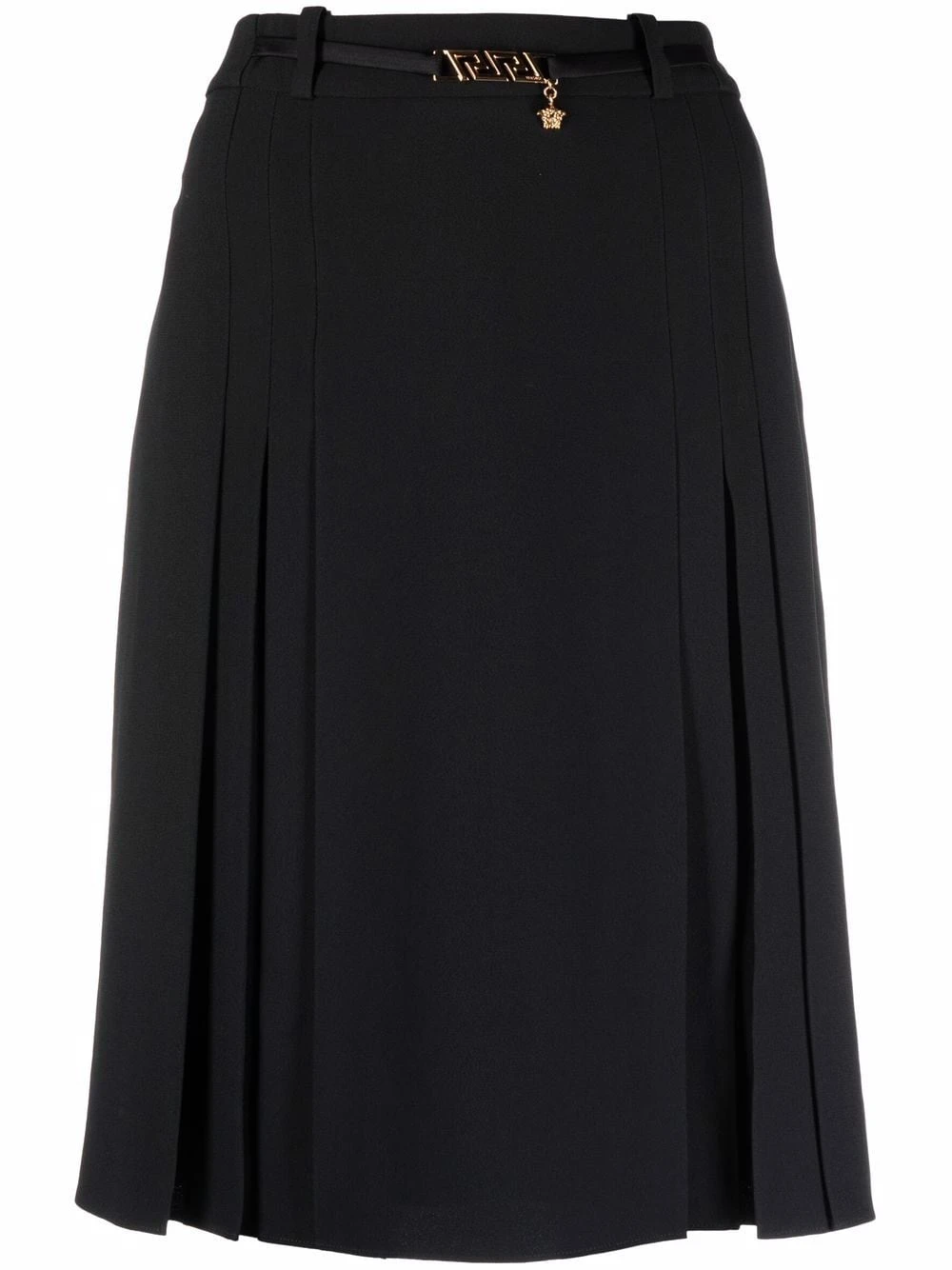 Détail Medusa, motif Greca signature imprimé, finitions en métal doré, taille haute, détails de plis. Couleur : noir. Matière : soie.