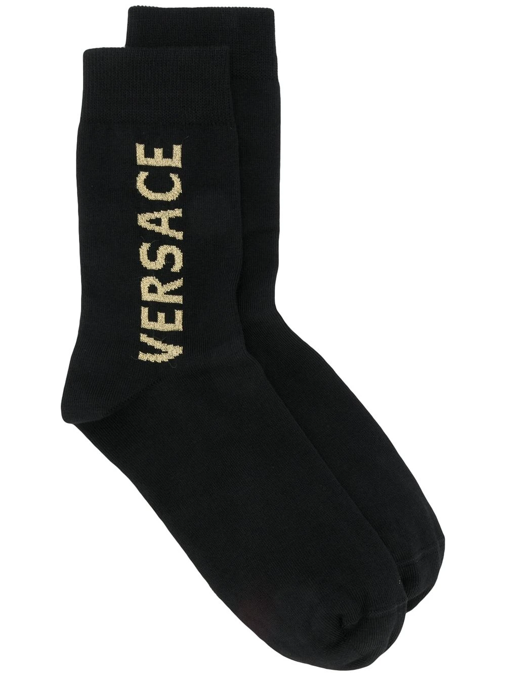Chaussettes à logo Versace avec ourlet nervuré. Couleur : noir. Les chaussettes et la bonneterie doivent être retournés dans leur emballage d’origine.