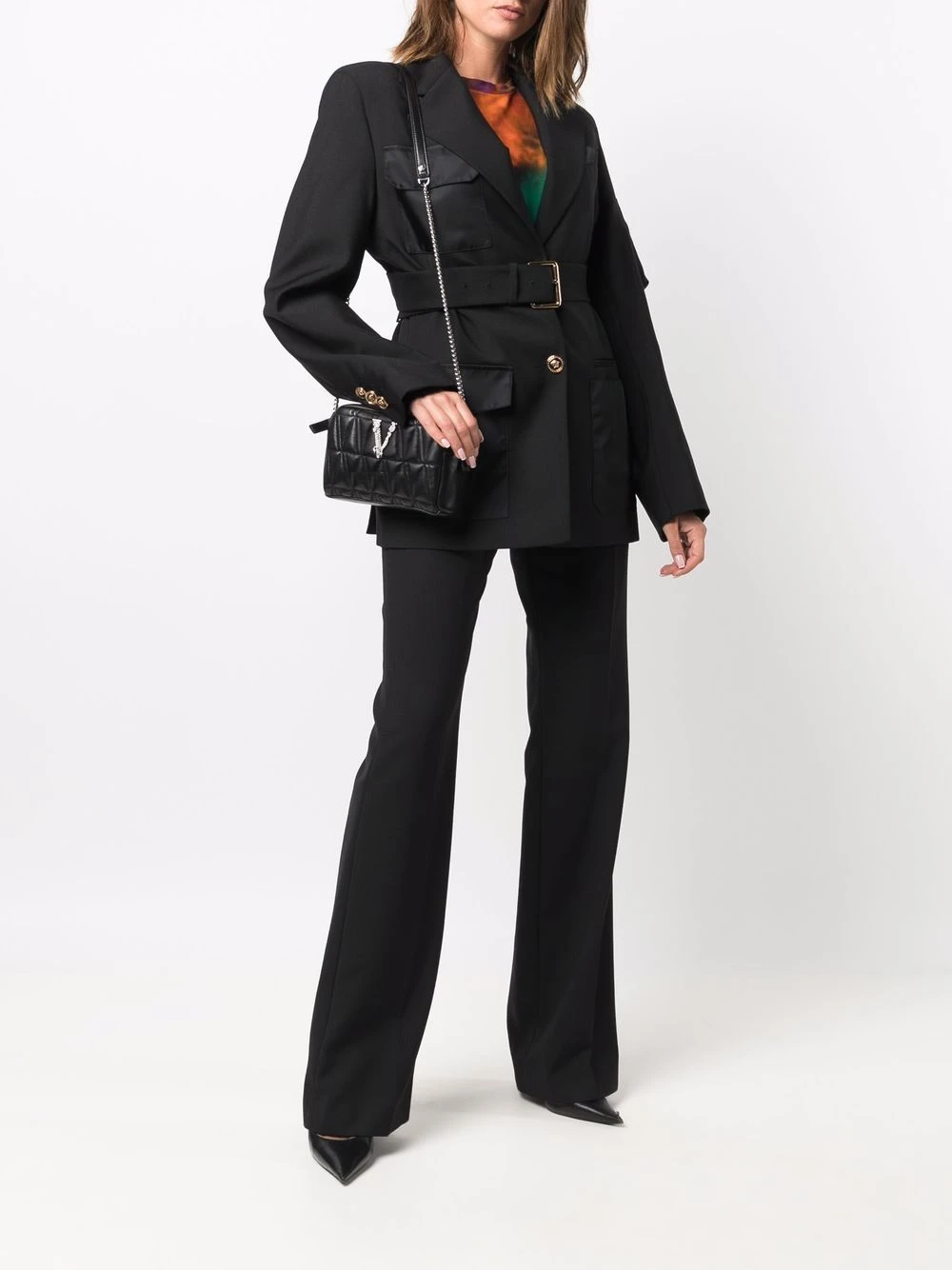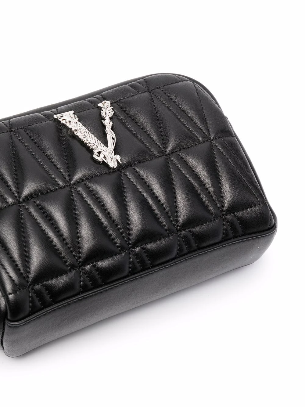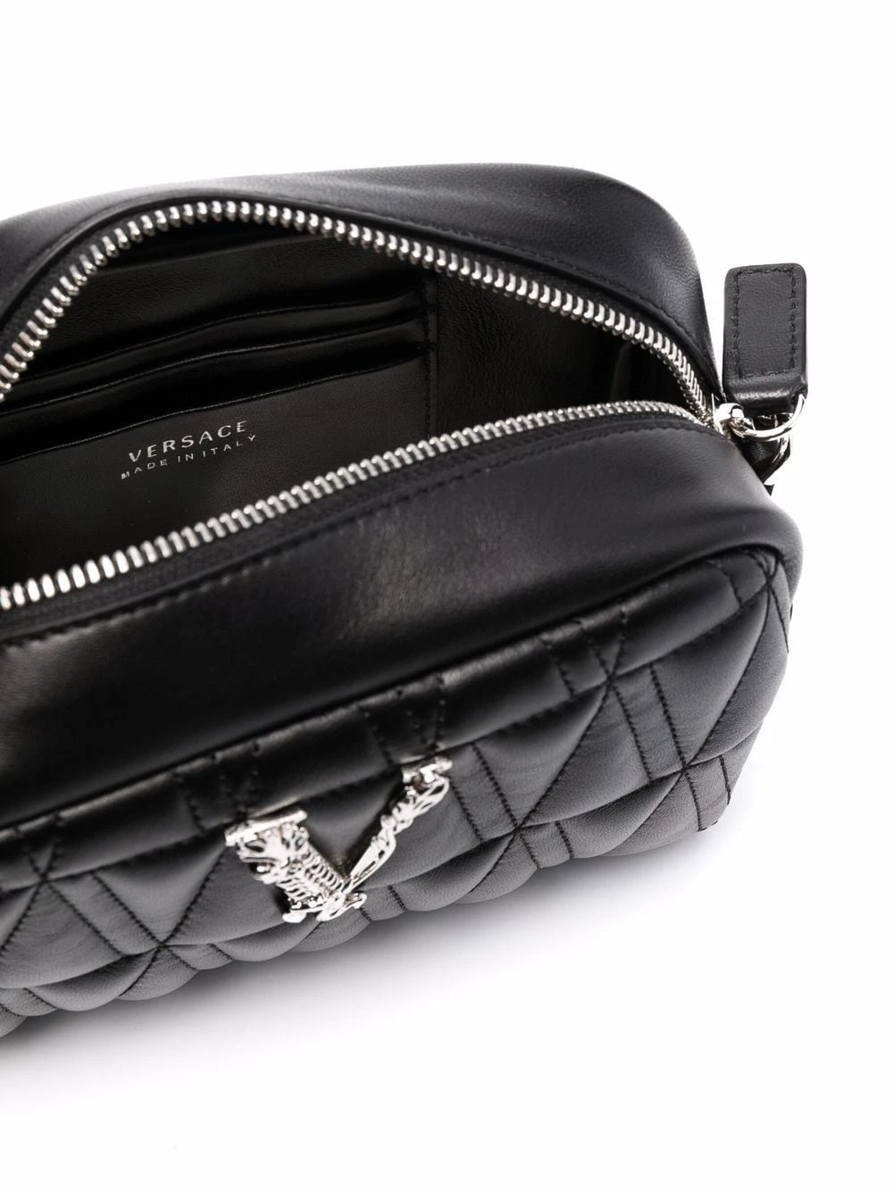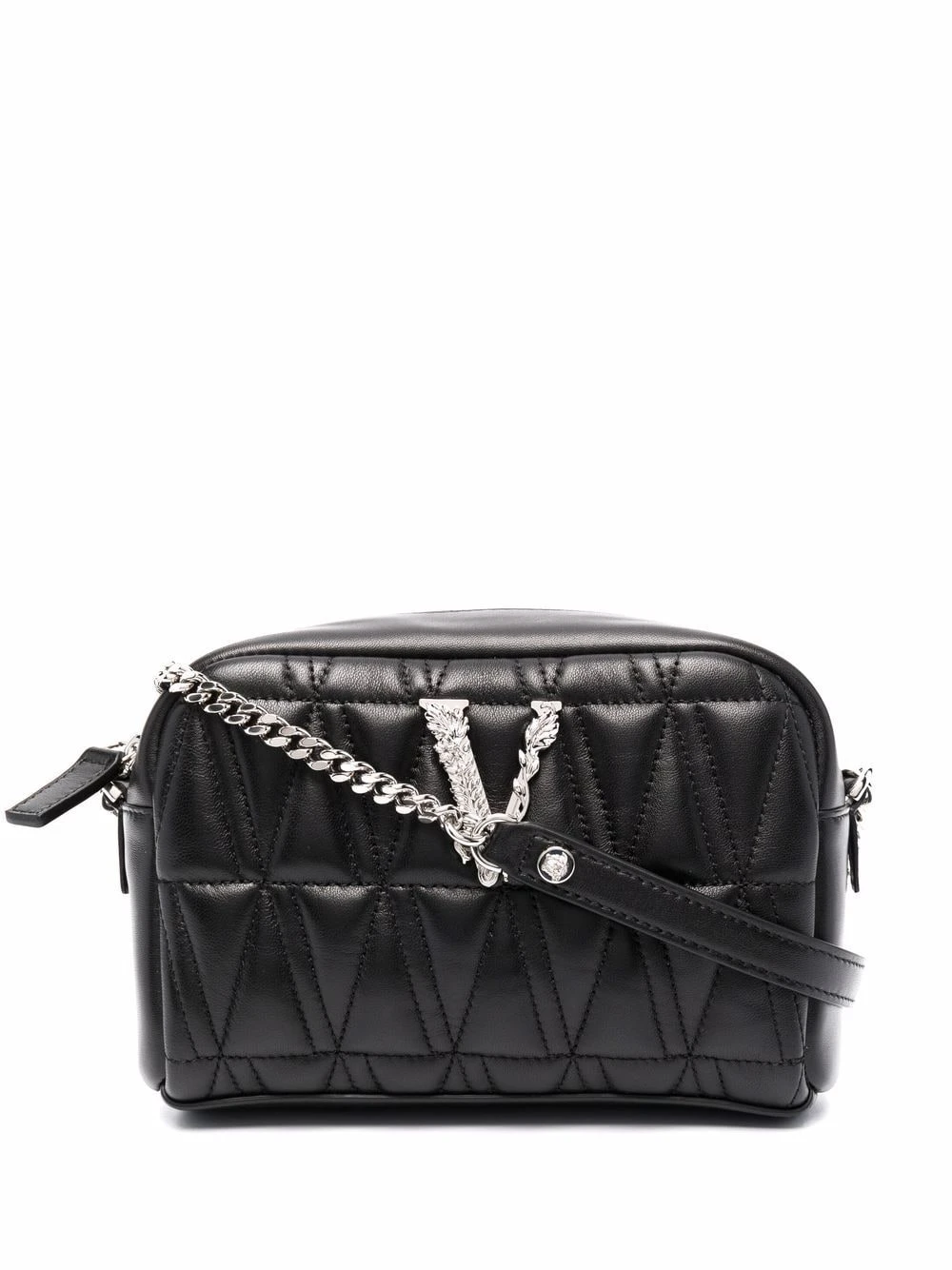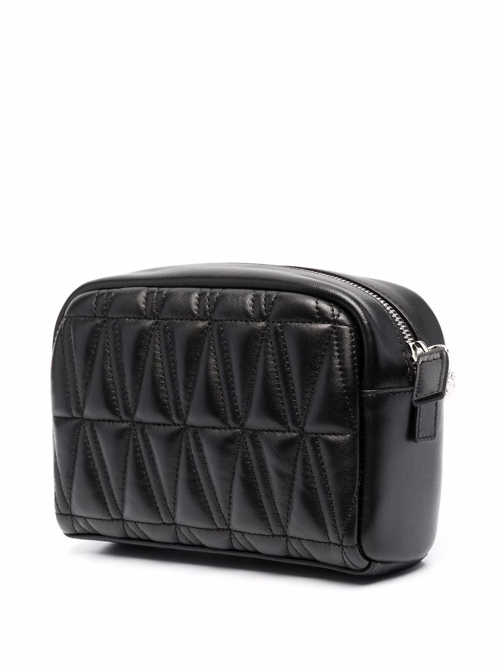 Effet matelassé, fermeture zippée sur le dessus, bride porté épaule détachable en cuir et maillons de chaîne. Couleur : noir. Matière : peau d’agneau.