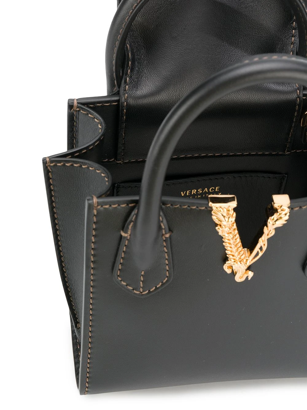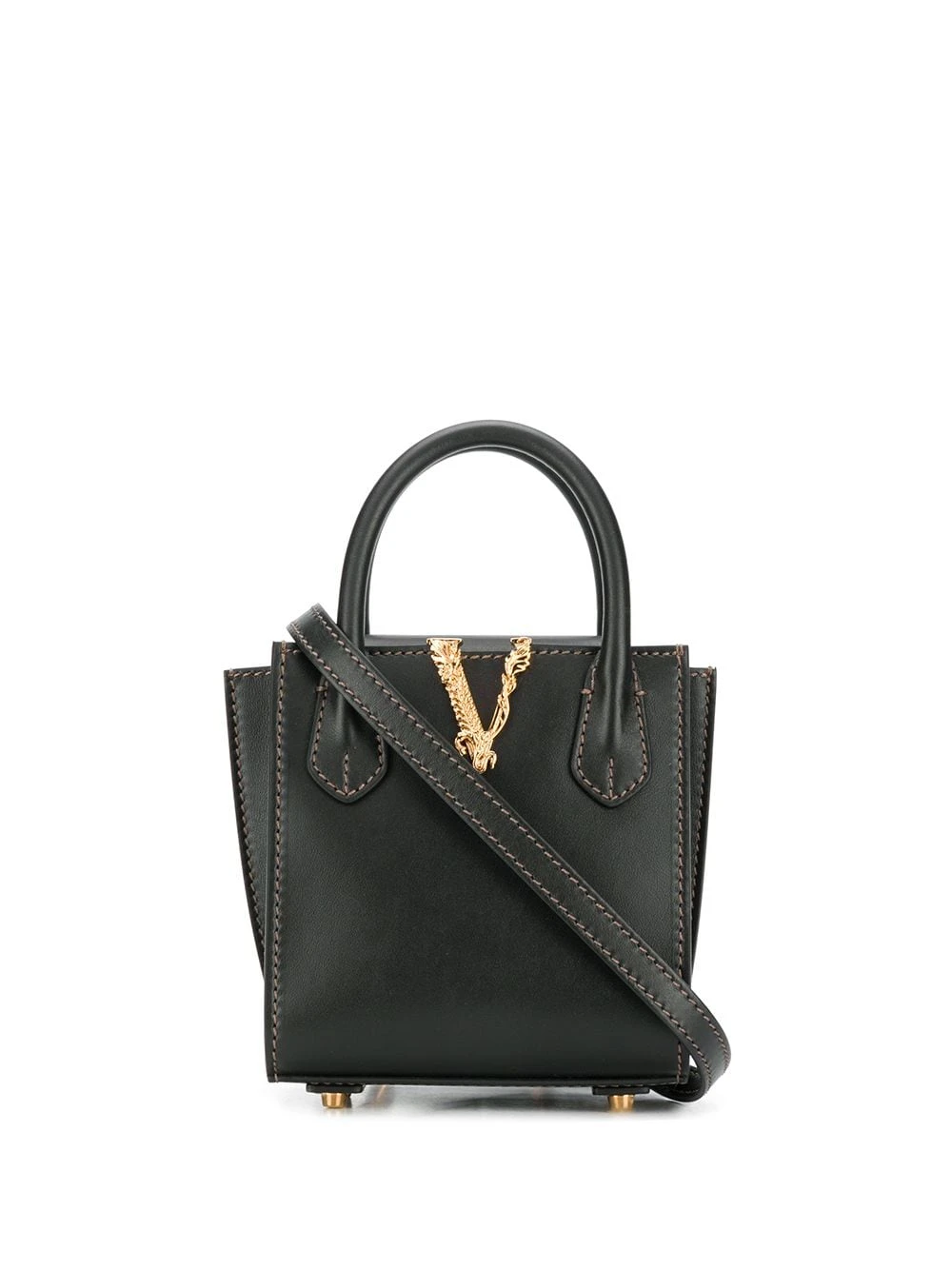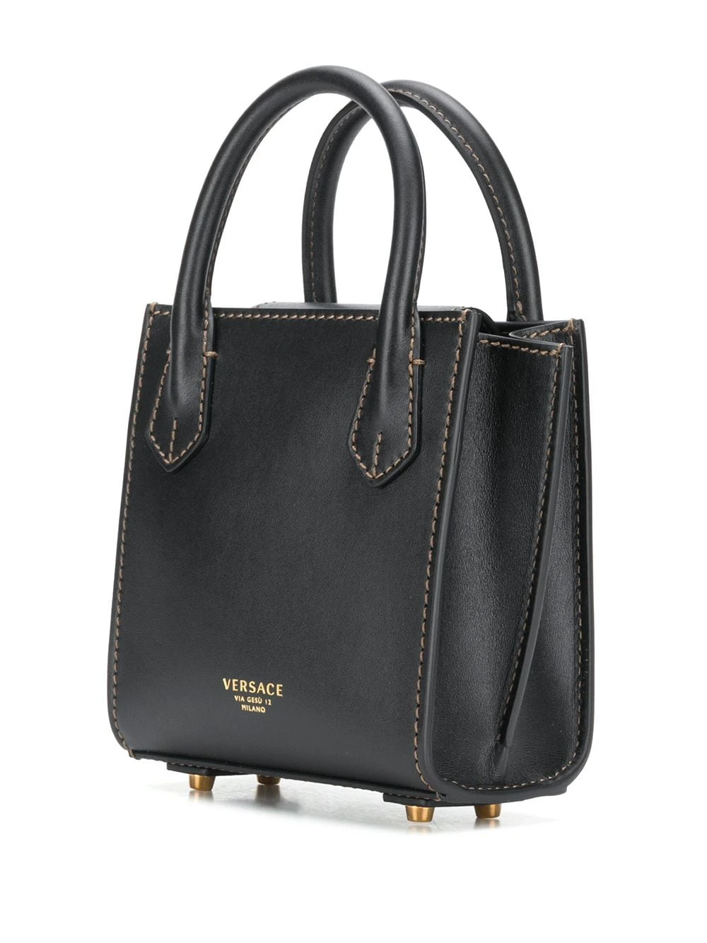 Plaque logo, finitions en métal doré, coutures contrastantes, anses sur le dessus, bride portée épaule détachable et ajustable, compartiment principal, fentes pour carte intérieures, pieds en métal. Couleur : noir. Matière : cuir.