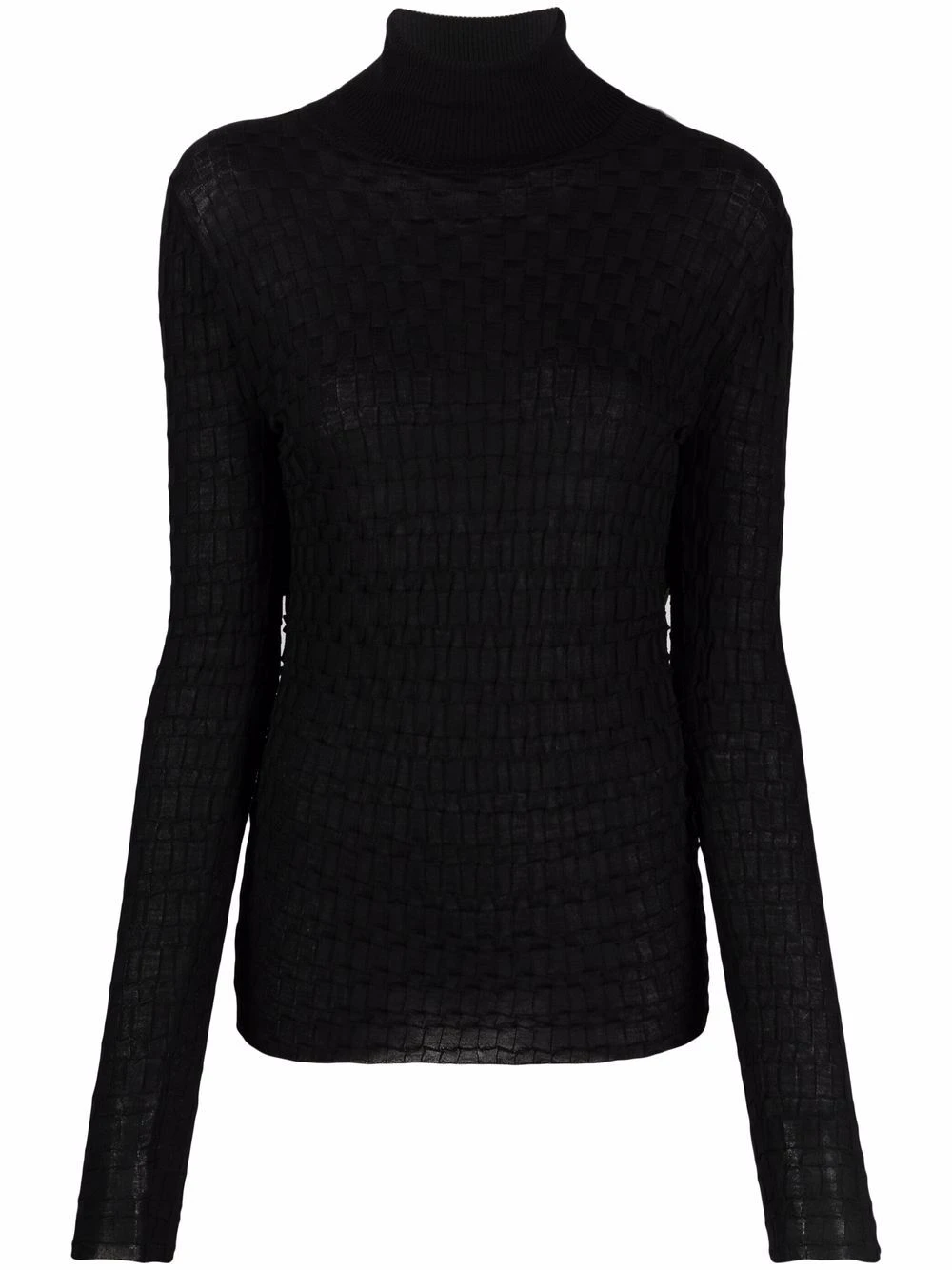 Design tricoté, motif Medusa, col roulé, manches longues, ourlet droit. Couleur : noir. Matière : laine vierge.