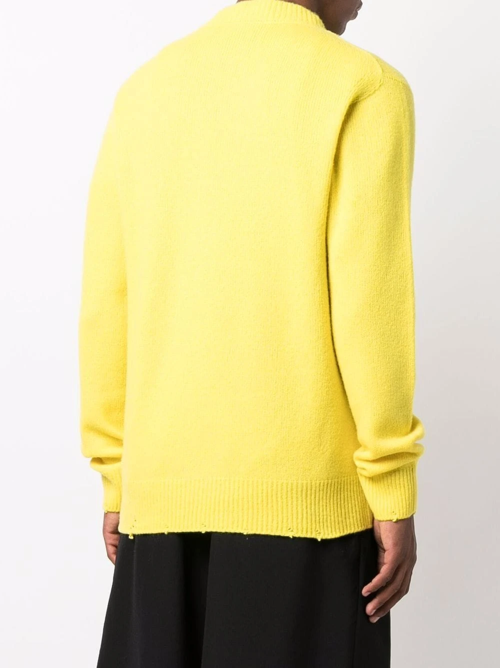 Jaune canari, motif Medusa, finitions effilochées, encolure ras du cou, manches longues, ourlet nervuré.