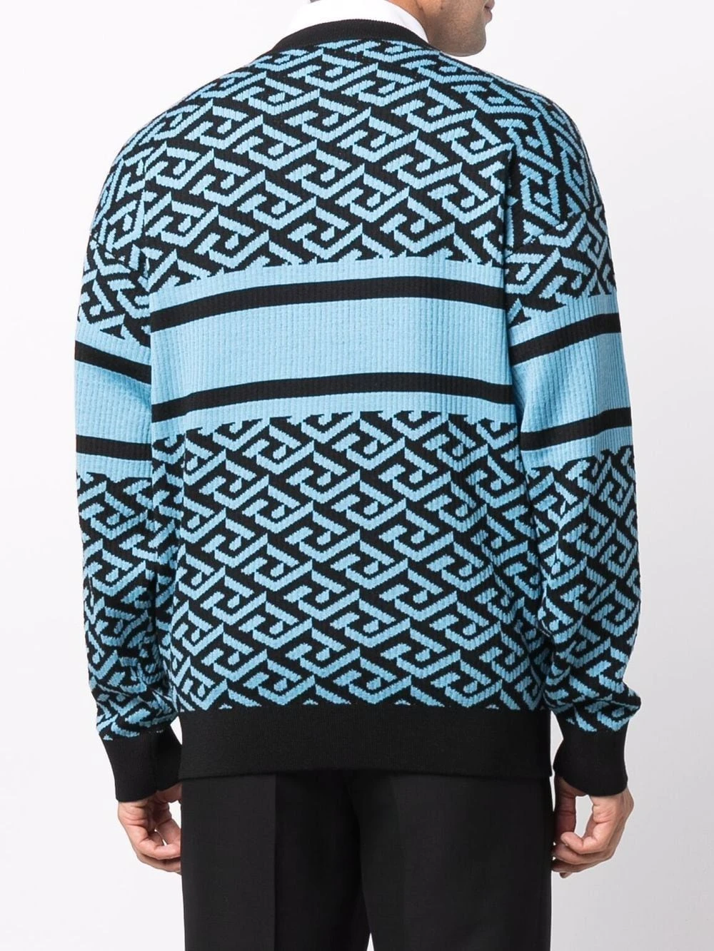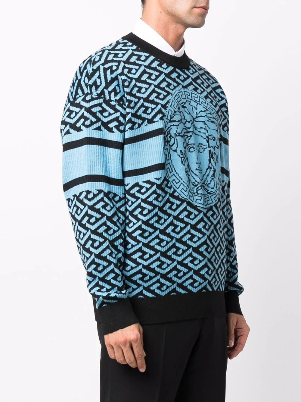 Imprimé La Greca signature, motif Medusa, jacquard à motifs, encolure ras du cou, effet d’épaules descendues, manches longues, poignets nervurés, ourlet nervuré.