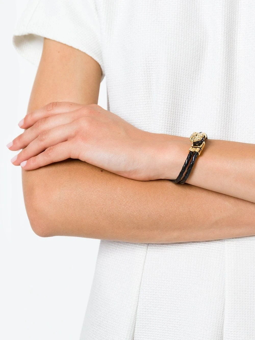 Bracelet Medusa en cuir de veau noir et métal doré Versace avec logo en relief à l’arrière et fermoir barrette.