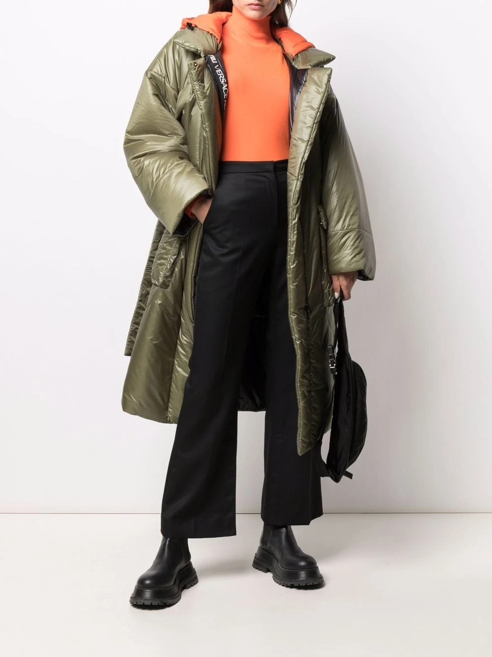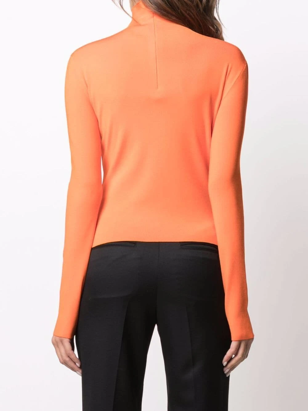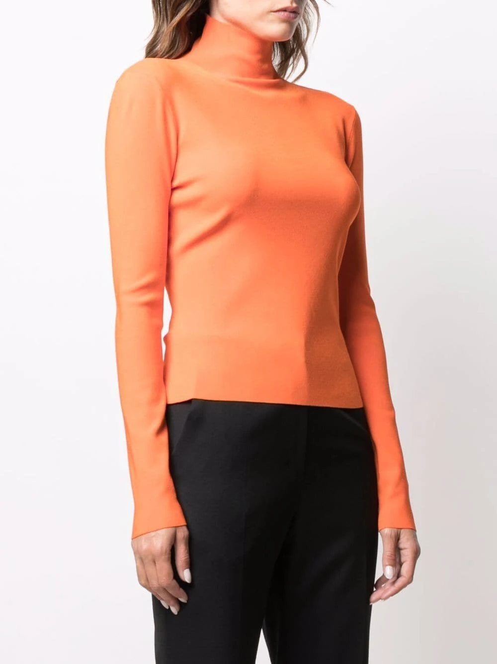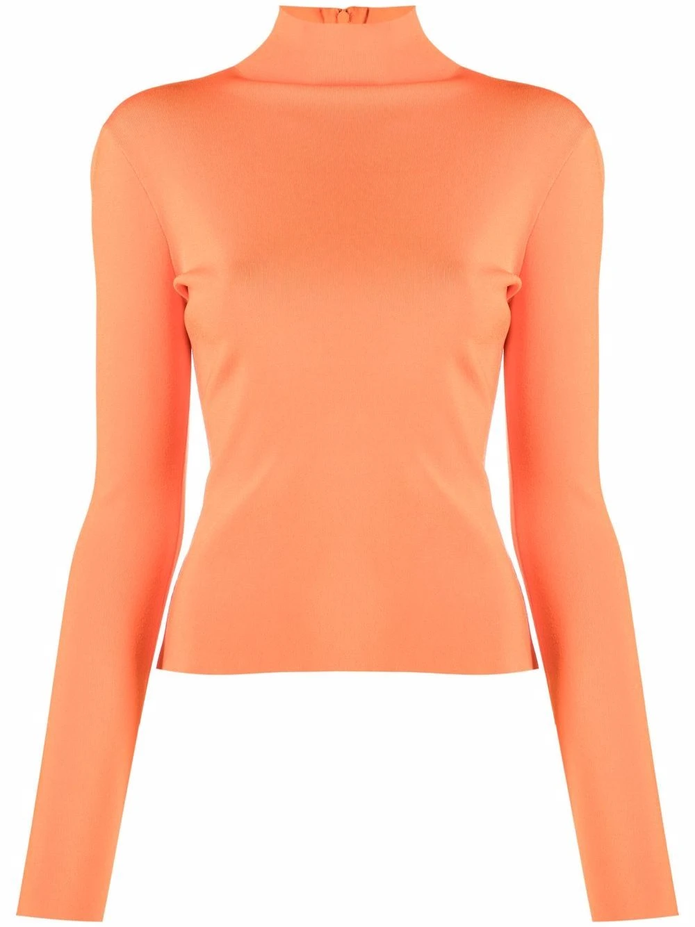 Tricot point jersey, col montant, manches longues, ourlet droit. Couleur : orange.