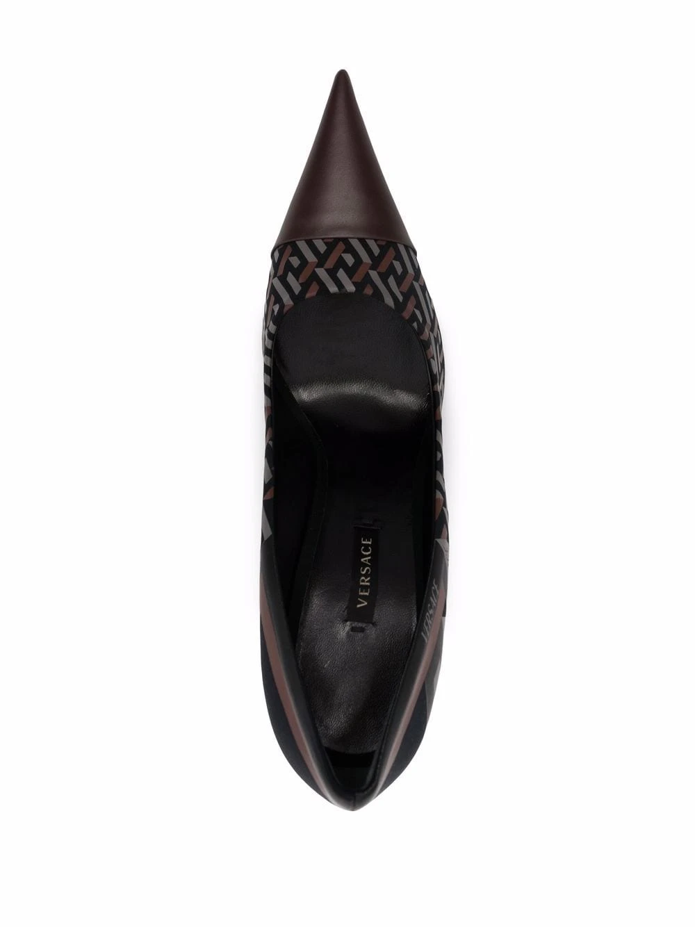 Motif Greca signature imprimé, bout pointu, bout contrastant, modèle bicolore, talon sculpté haut. Matière : cuir.