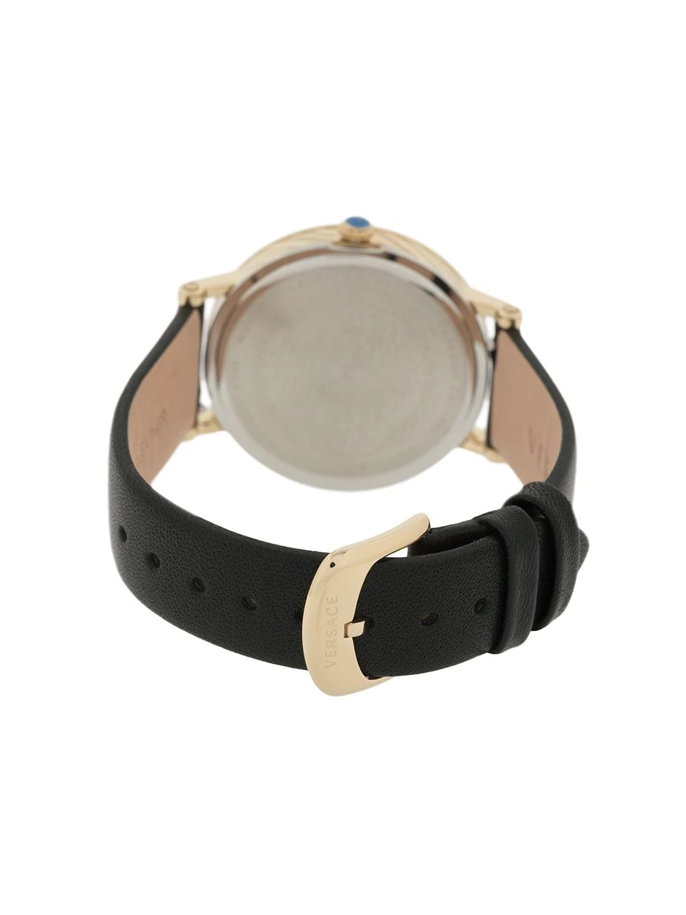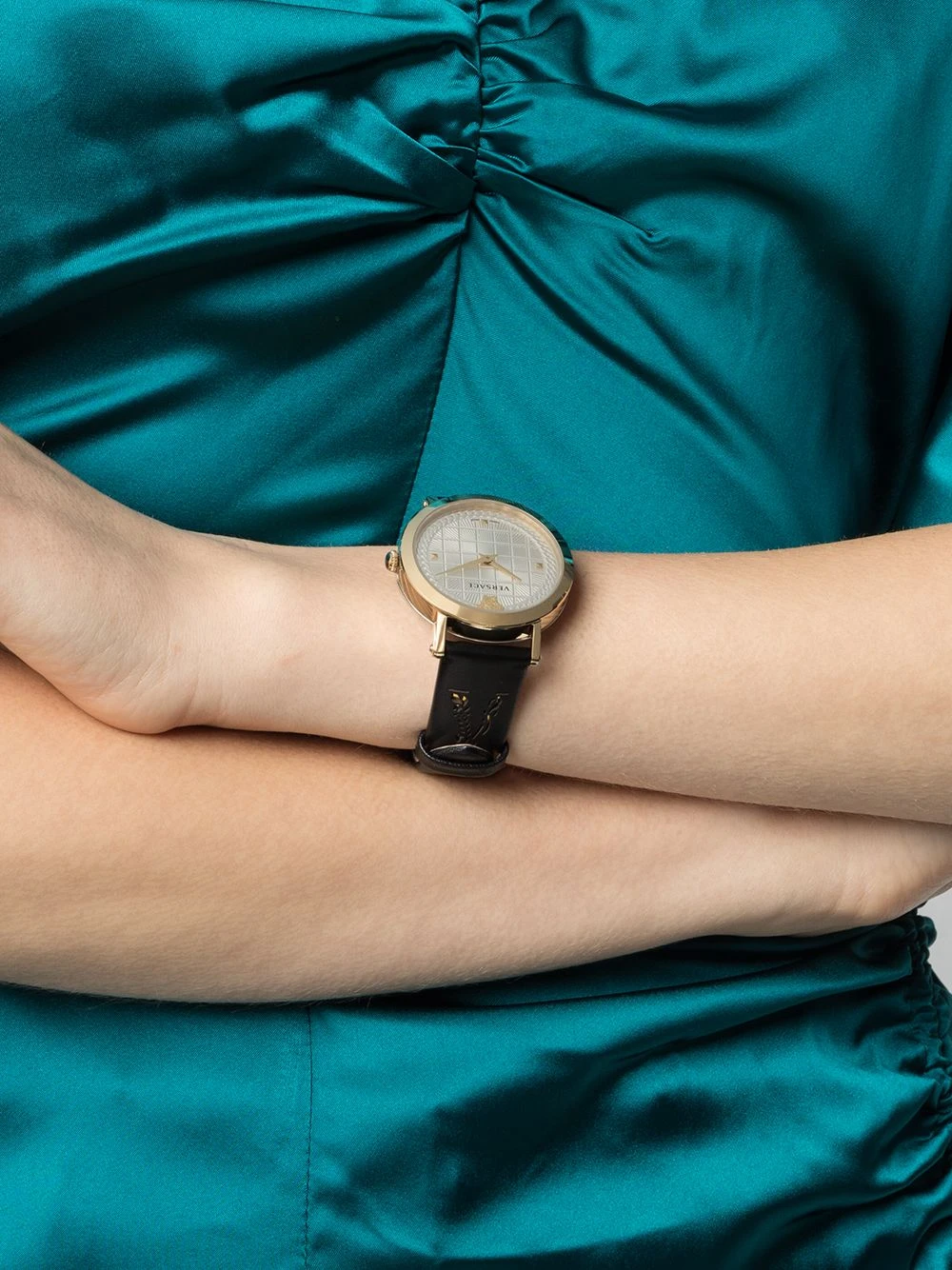Détail Medusa, mouvement à quartz, cadran à indicateur, boîtier rond, bracelet en cuir, fermeture à boucle dorée, étanche jusqu’à 50 m/5 ATM. Matière : acier inoxydable.