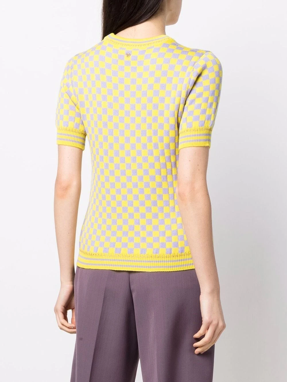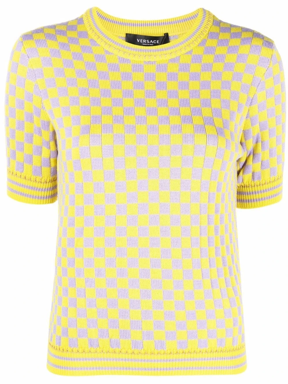 Design en maille, motif damier, encolure ras du cou, manches courtes.