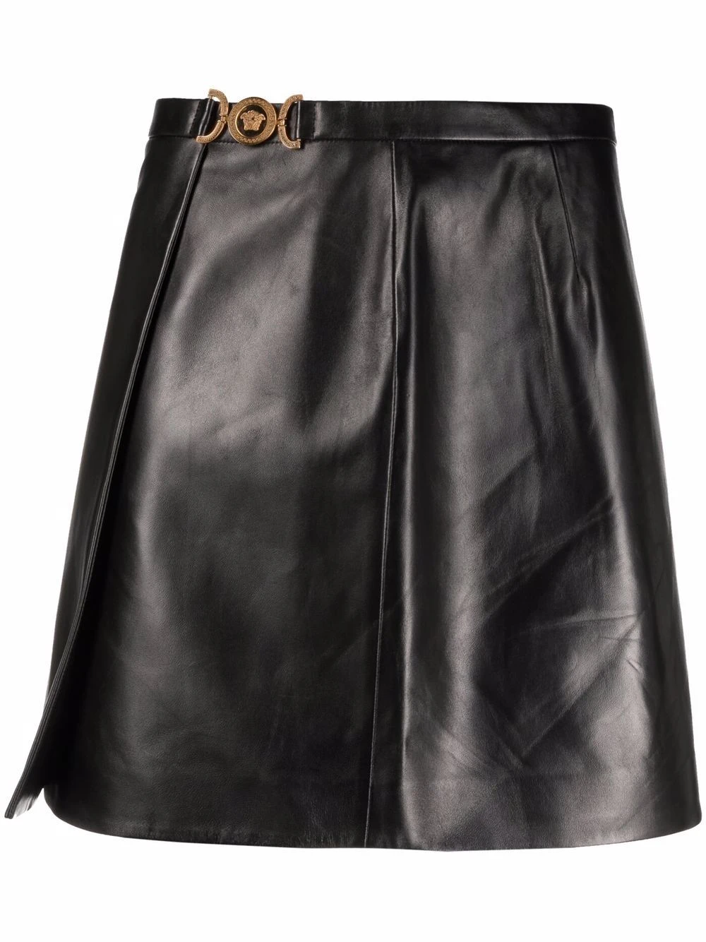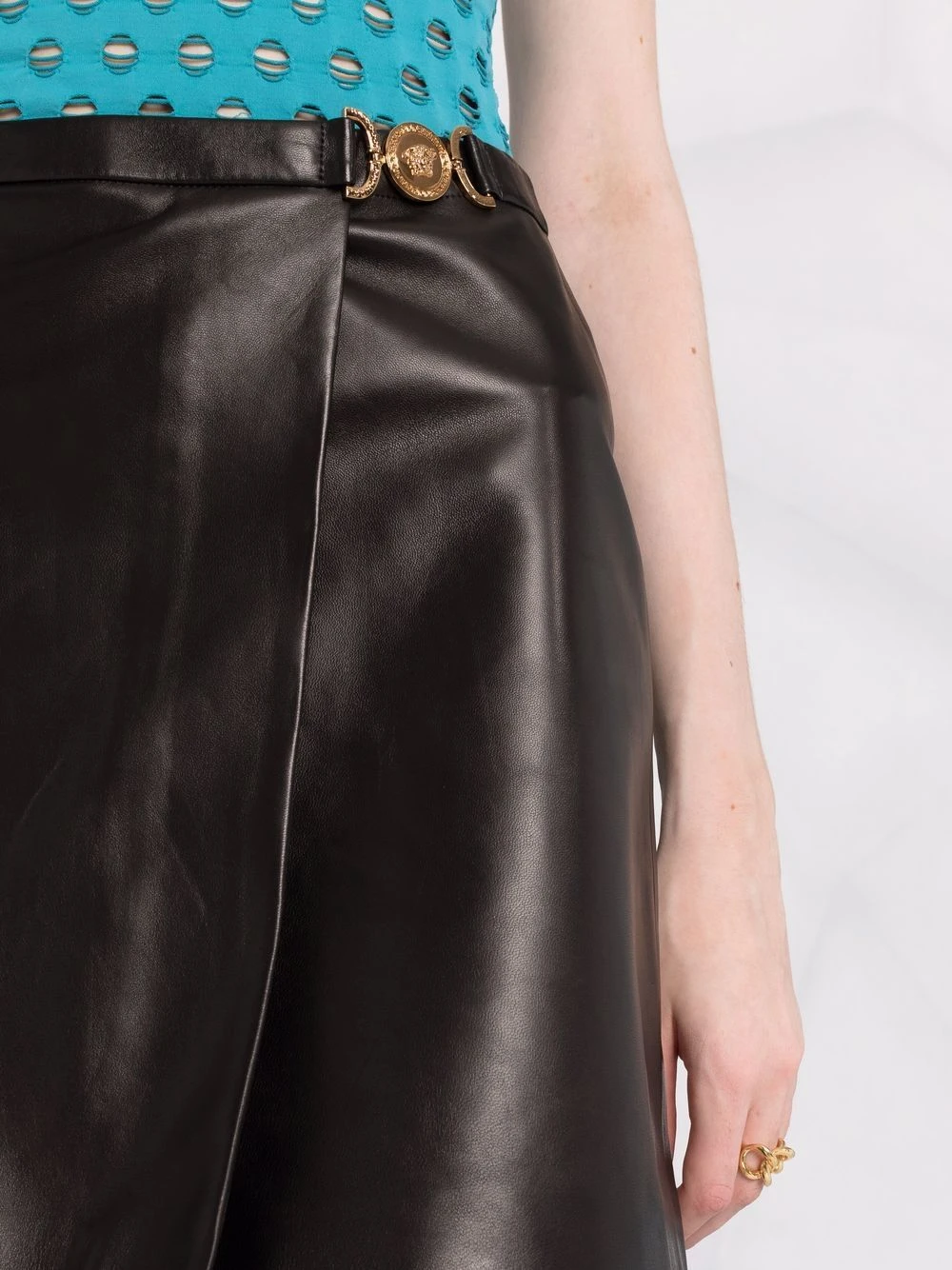 Taille haute, détail Medusa, finitions en métal doré, design portefeuille, coutures ton sur ton, ourlet incurvé, longueur au dessus du genou. Couleur : noir.