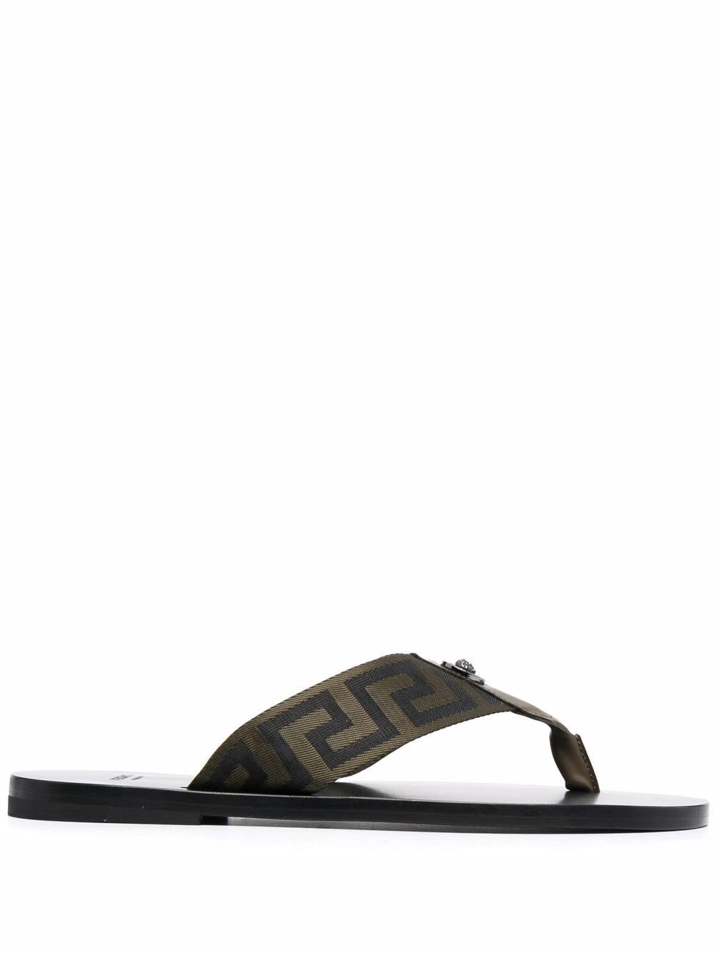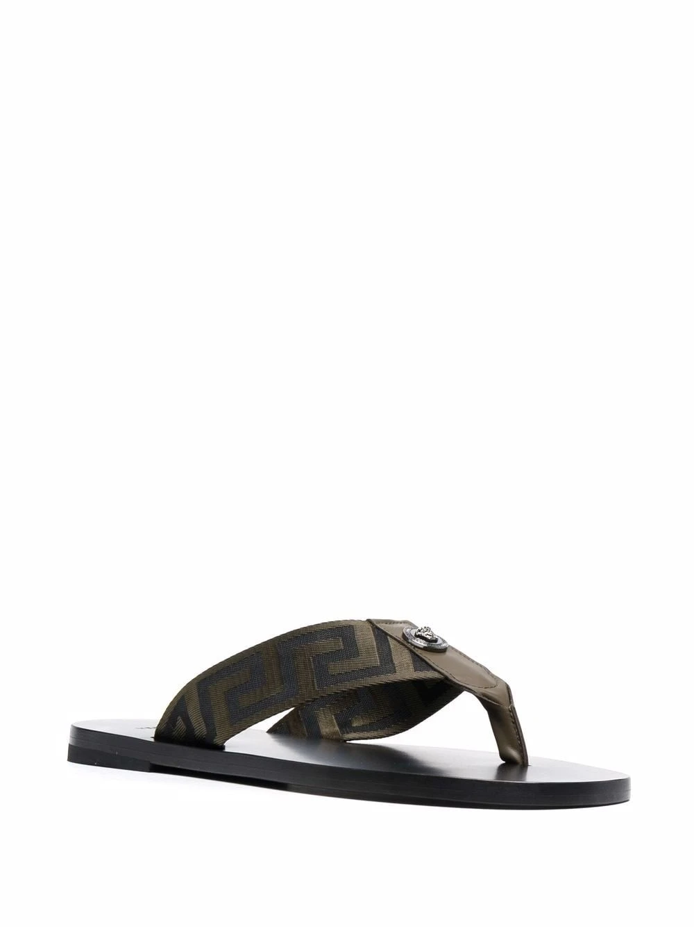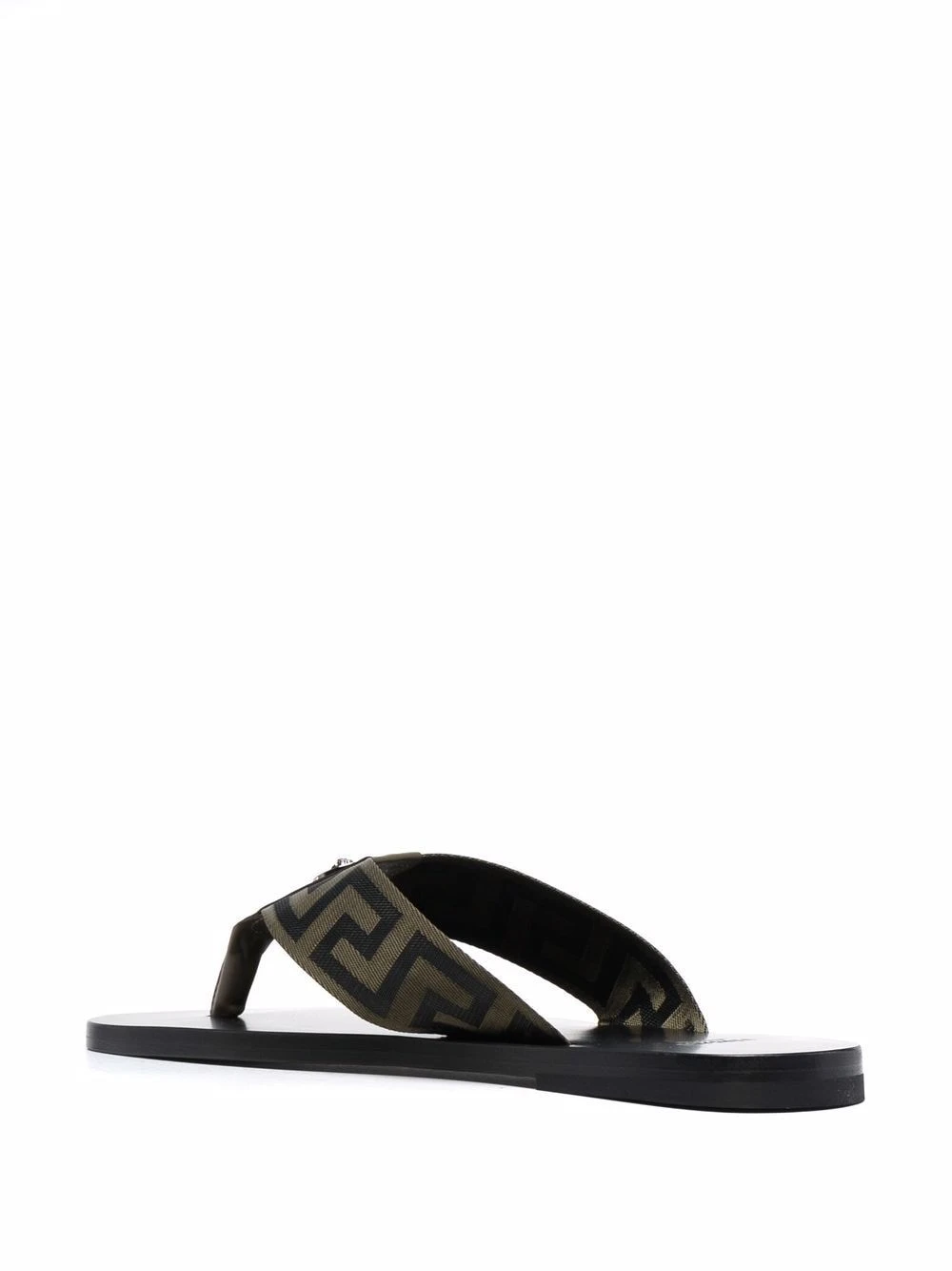 Détail Greca signature, semelle intérieure à logo, bout ouvert, design à enfiler, semelle plate, logo imprimé à l’intérieur.