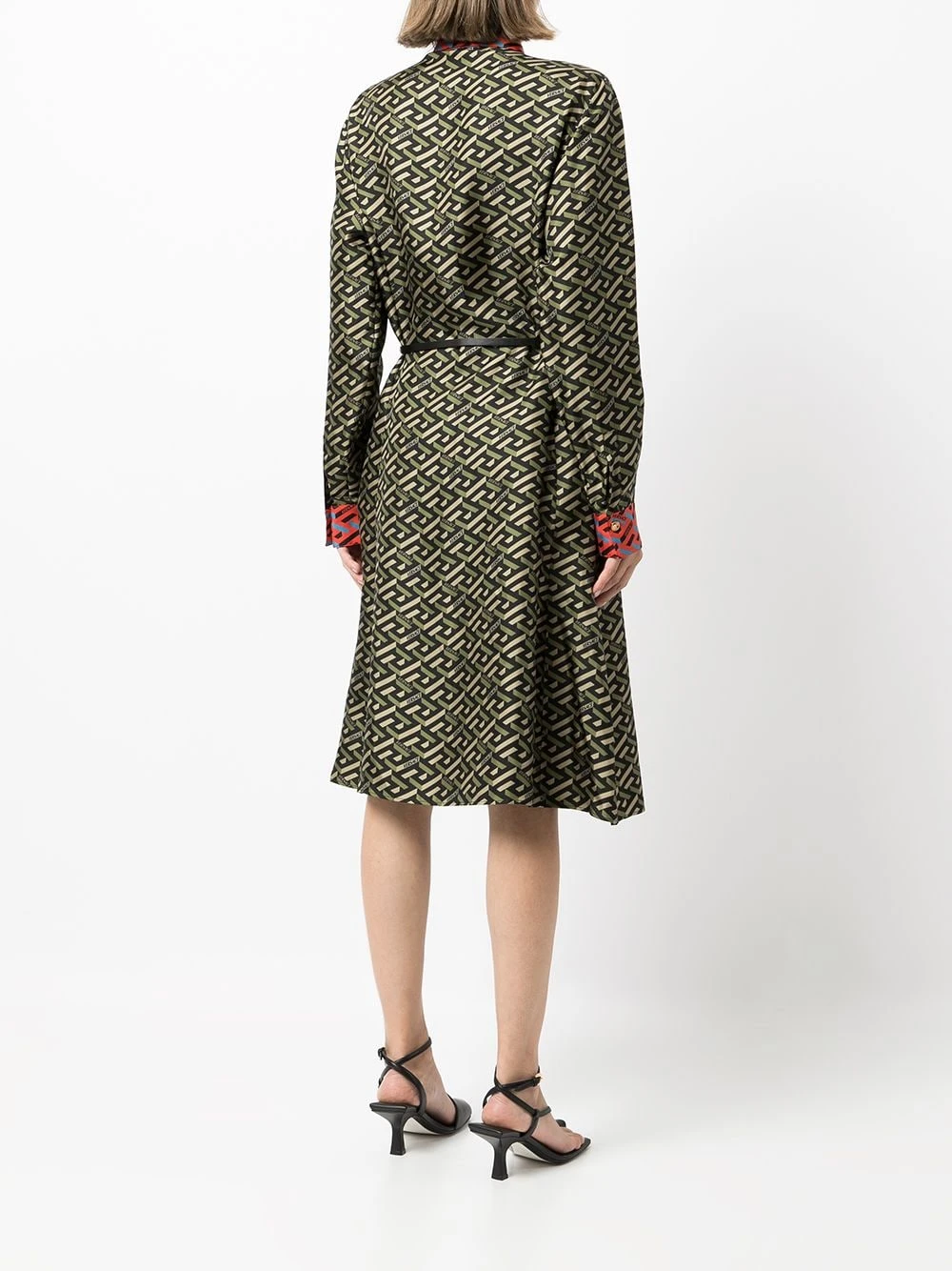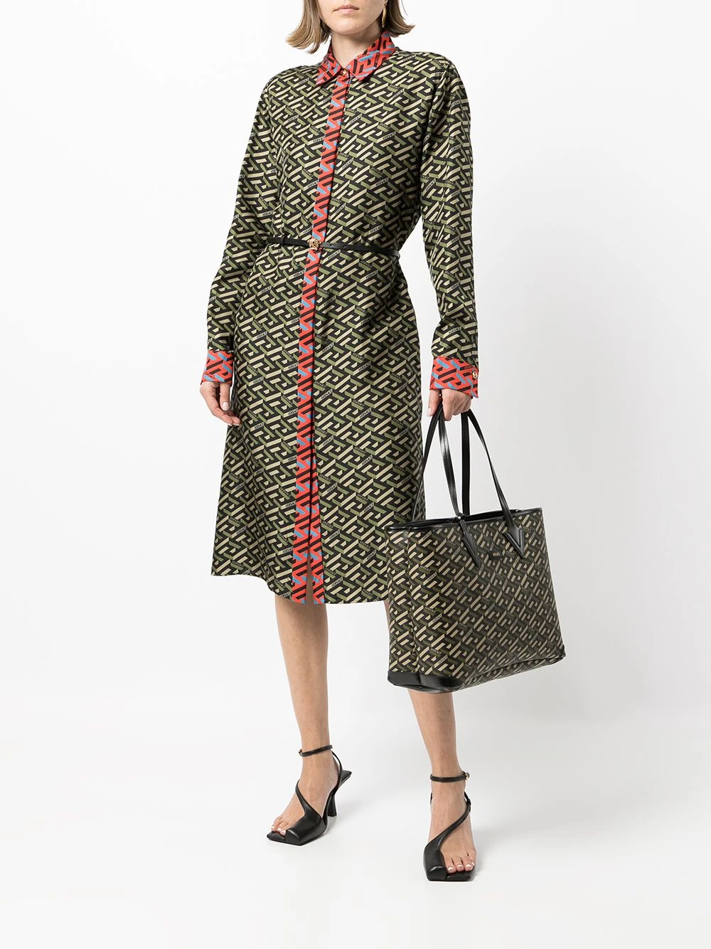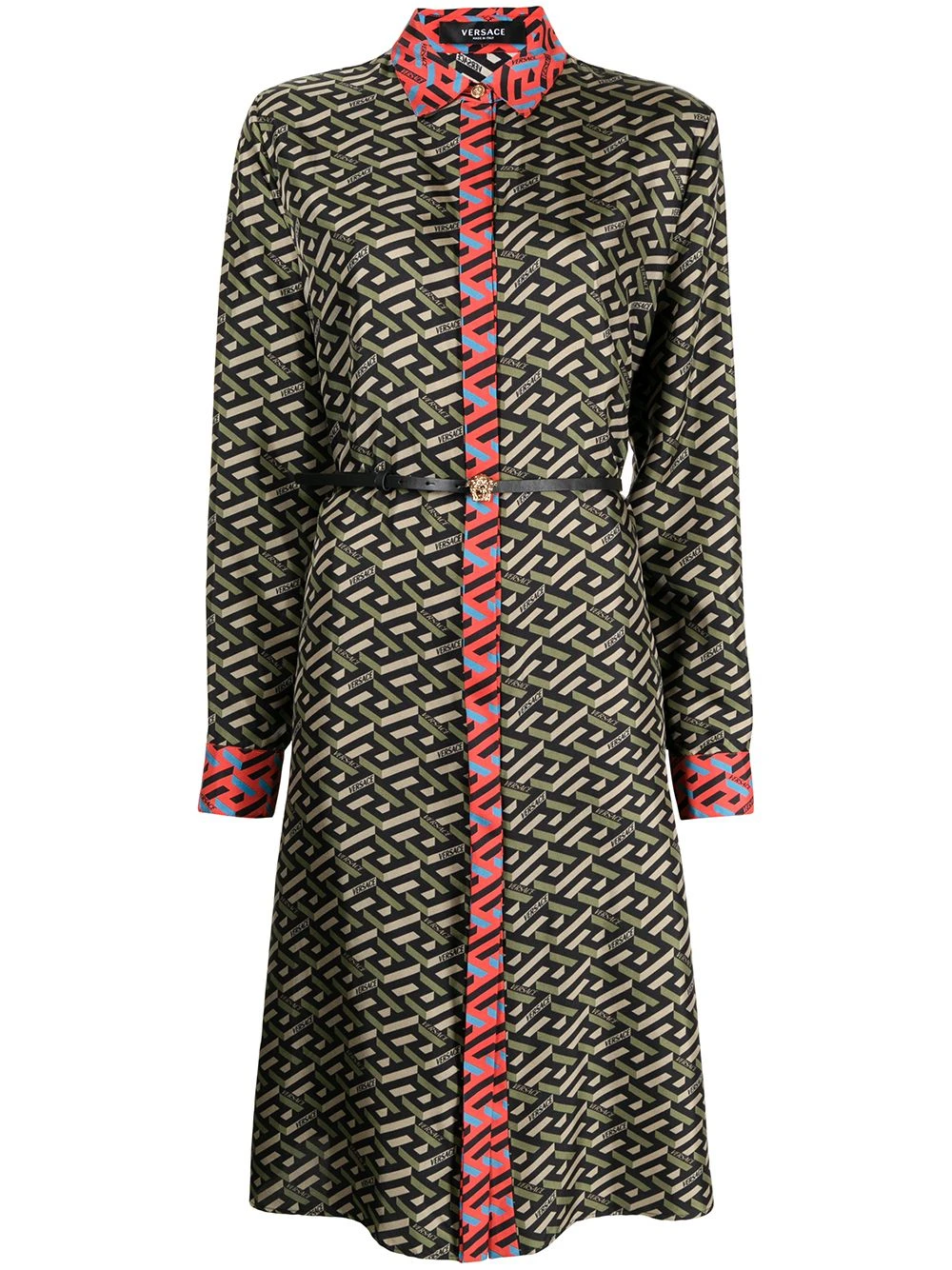 Détail Greca signature, col classique, boutonnière sur le devant, manches longues. Matière : soie.