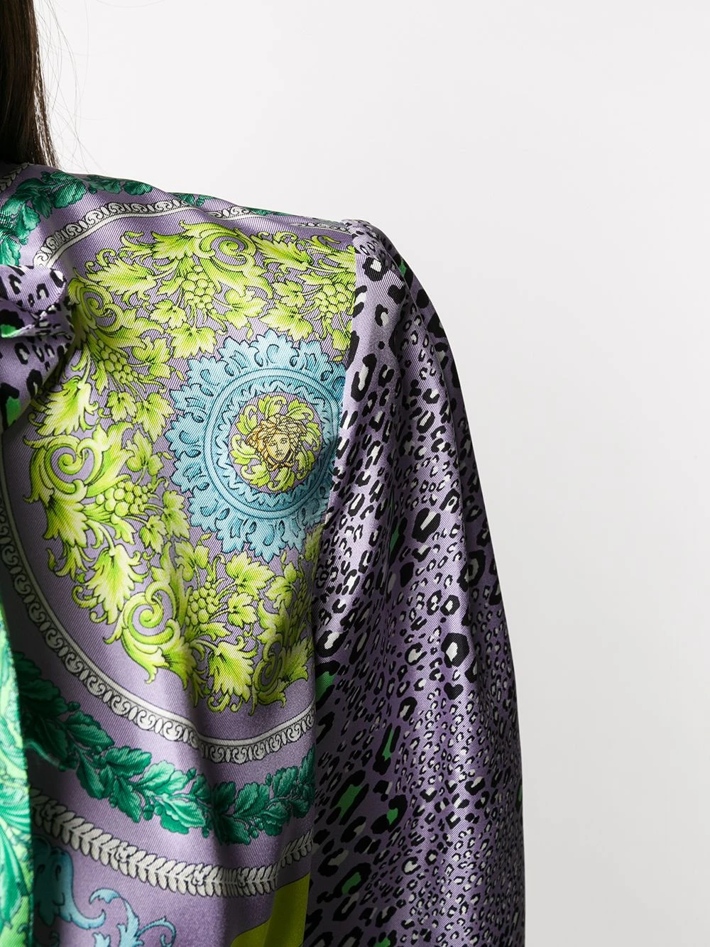 Imprimé Barocco signature, col lavallière à nouer, taille ceinturée, détails de plis, manches longues, poignets boutonnés, épaulettes, fermeture zippée dissimulée à l’arrière. Matière : soie.