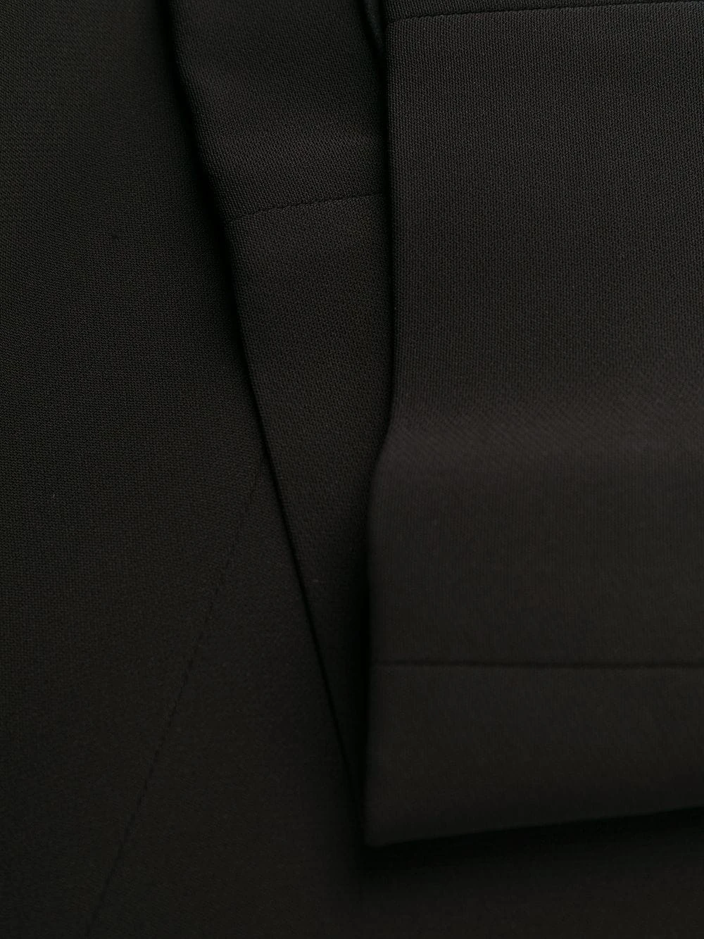 Détail de zip, boutons dorés à détails embossés, finitions en métal doré, col v, fermeture zippée à l’arrière, design sans manches. Couleur : noir.