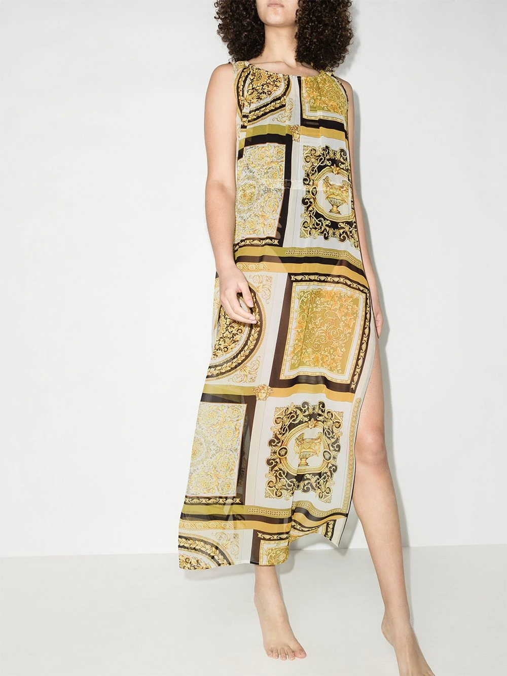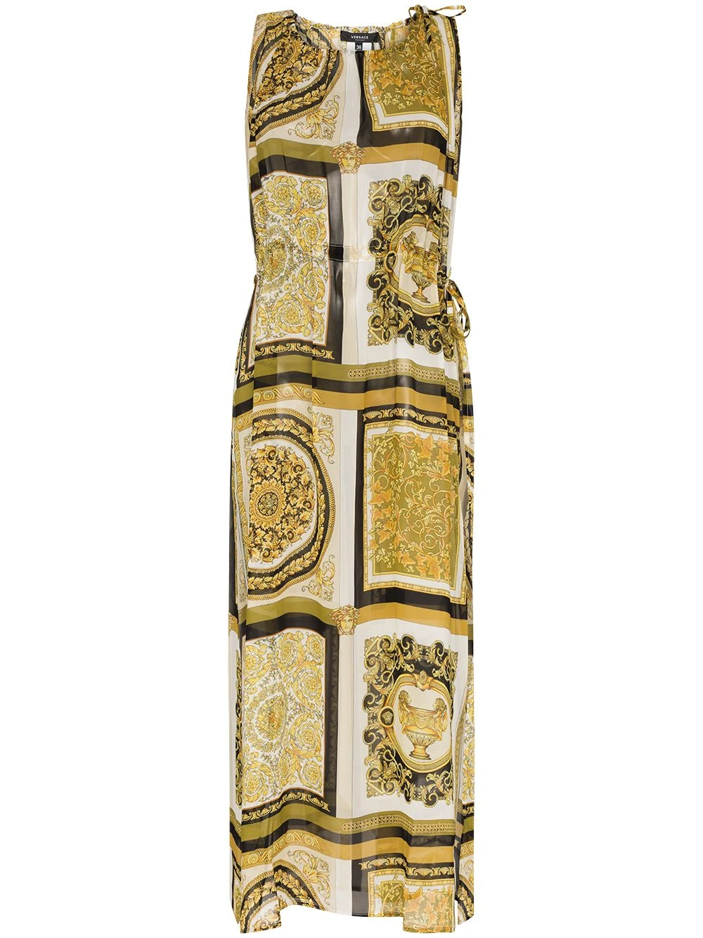 Effet de transparence, motif Greca signature imprimé, encolure ronde, manches courtes. Couleur : blanc. Matière : soie.