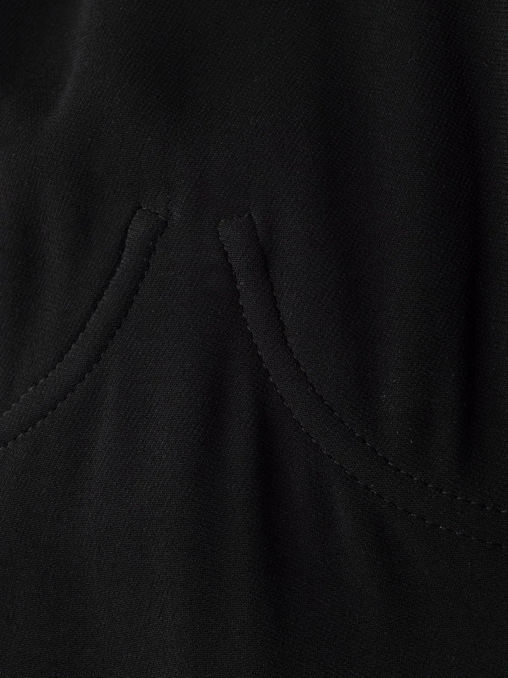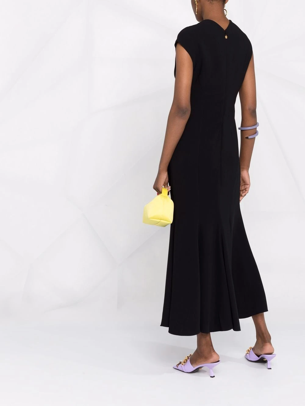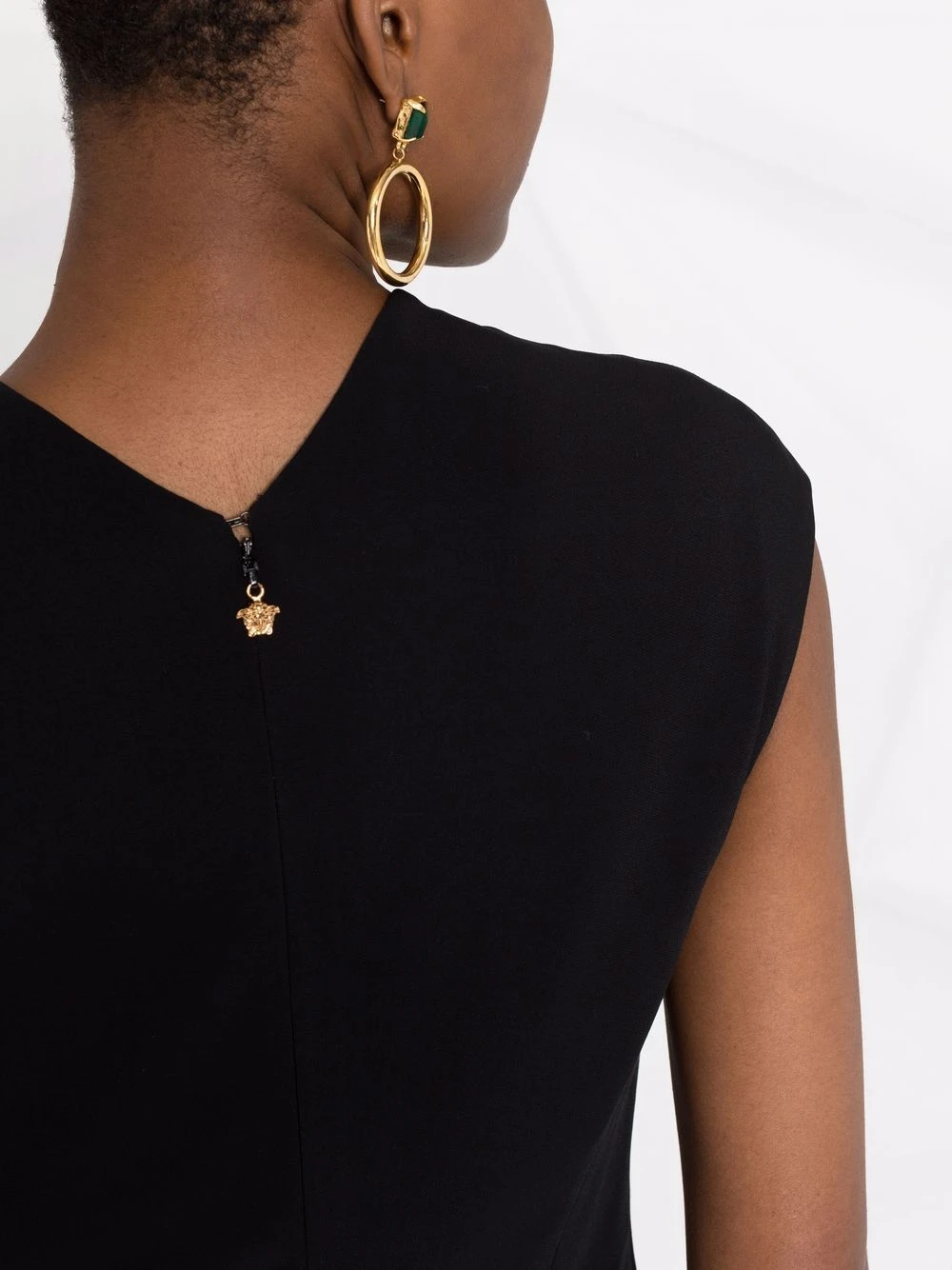 Col montant, mancherons, fermeture zippée dissimulée à l’arrière, motif Medusa, finitions en métal doré, jupe trapèze, longueur midi. Couleur : noir.