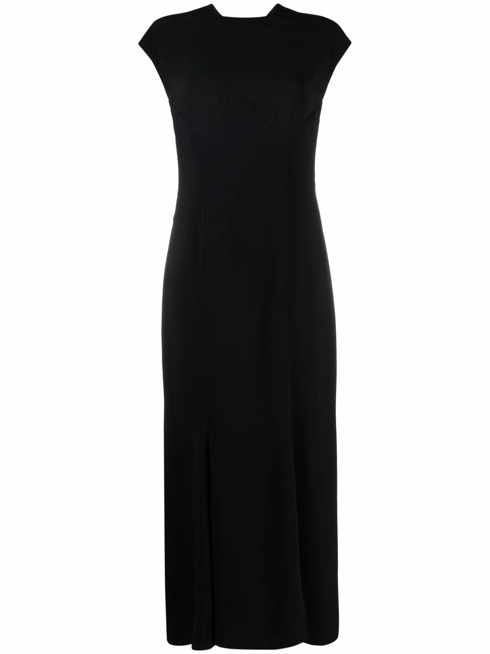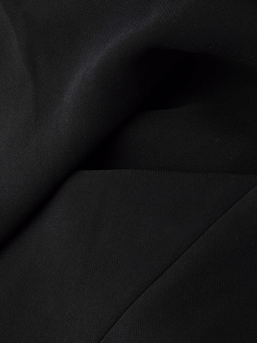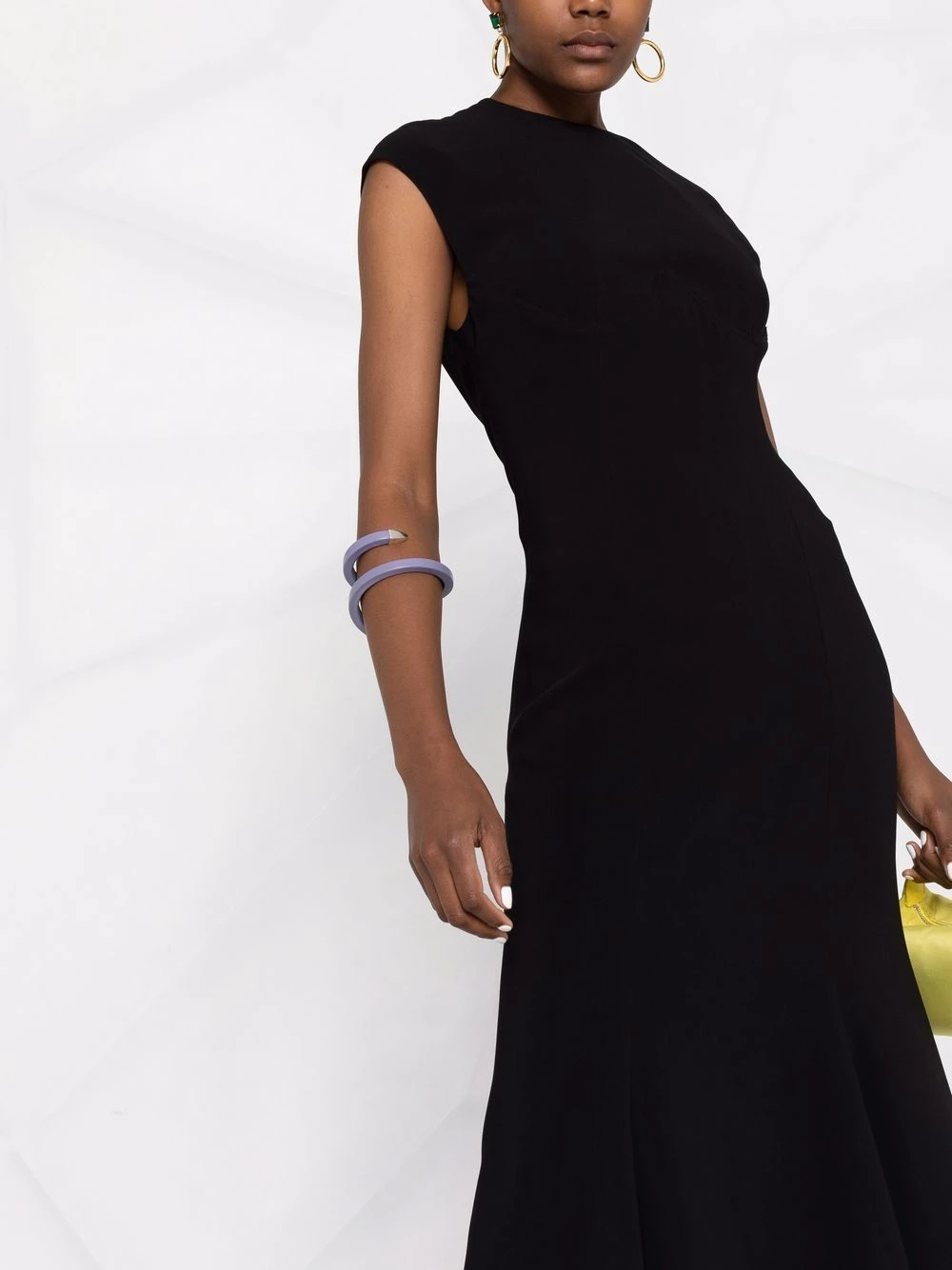 Col montant, mancherons, fermeture zippée dissimulée à l’arrière, motif Medusa, finitions en métal doré, jupe trapèze, longueur midi. Couleur : noir.