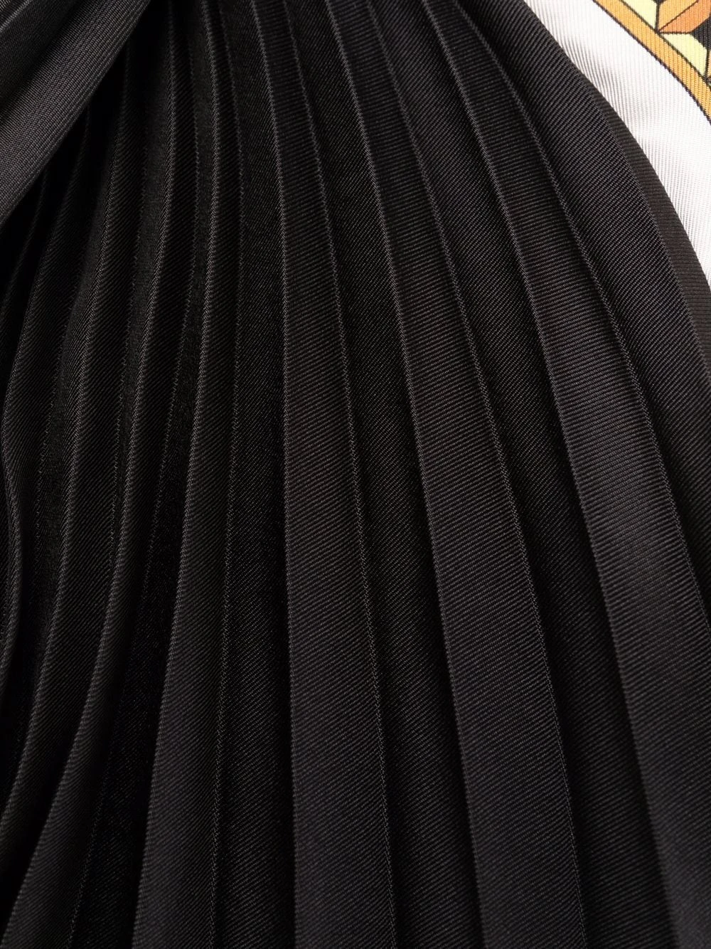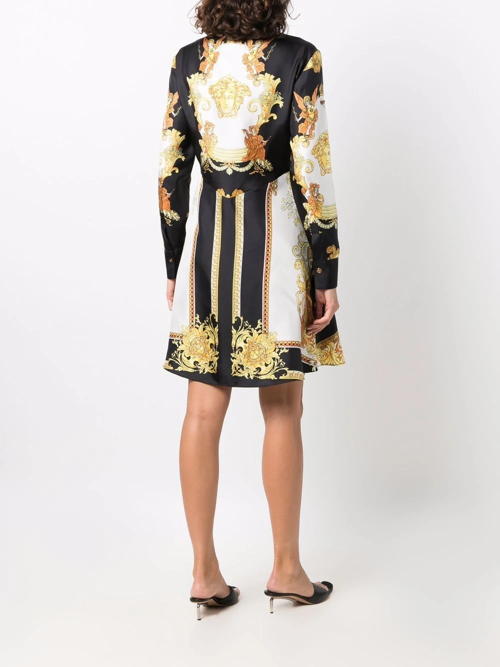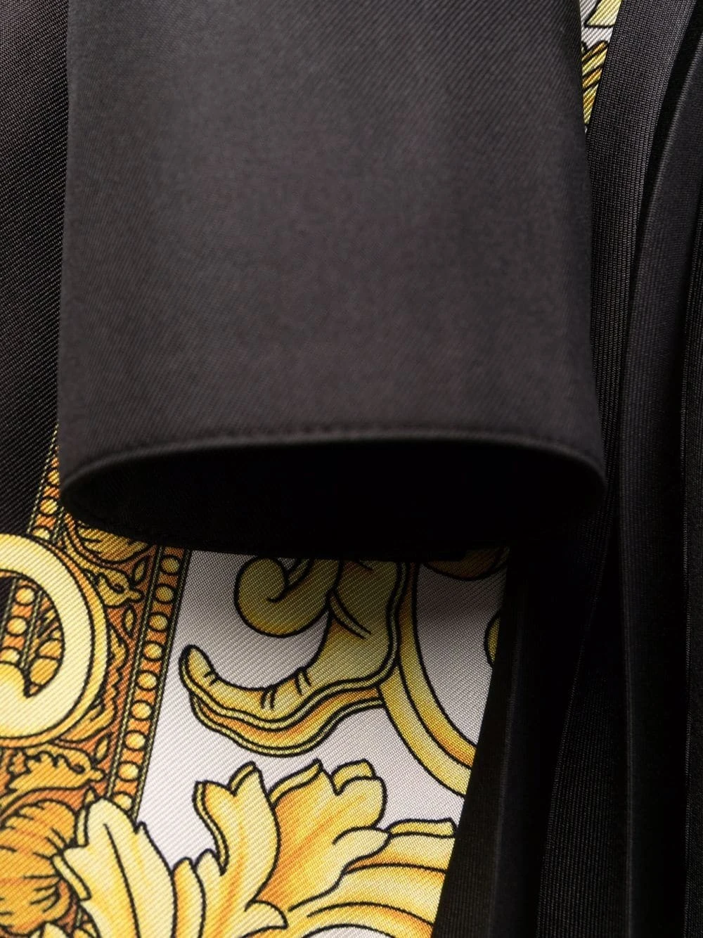 Motif baroque, col classique, manches longues, détails de plis, boutonnière sur le devant, jupe trapèze. Matière : soie.