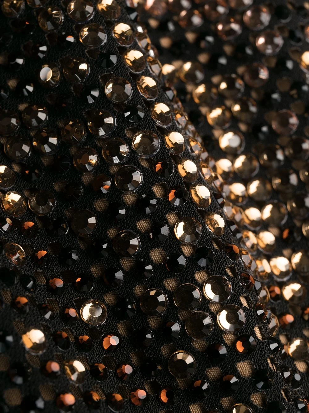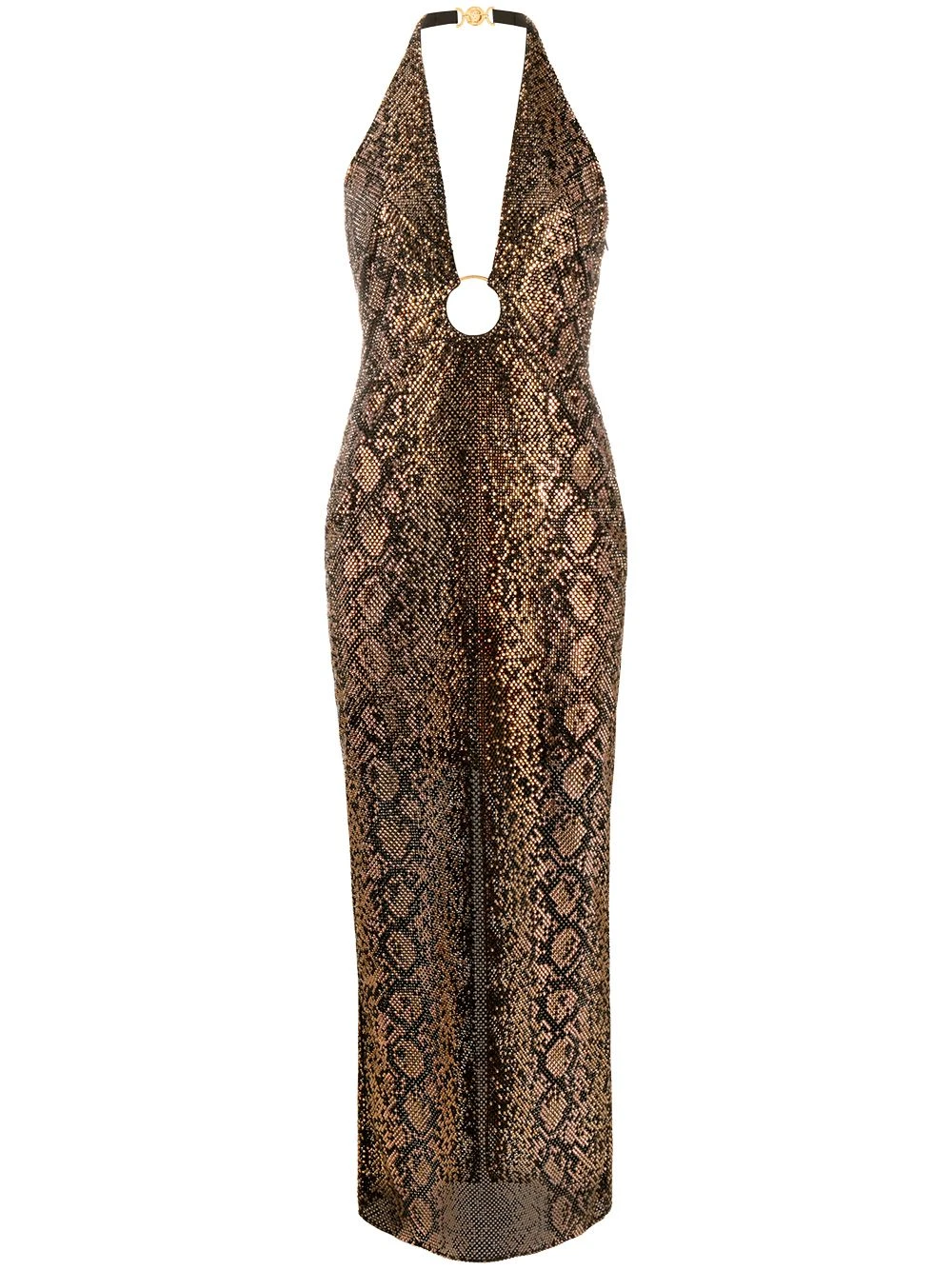 Imprimé python, détails de clous, motif Medusa, fermeture zippée sur le côté, dos-nu, détails de découpes, effet de transparence, coupe longue.