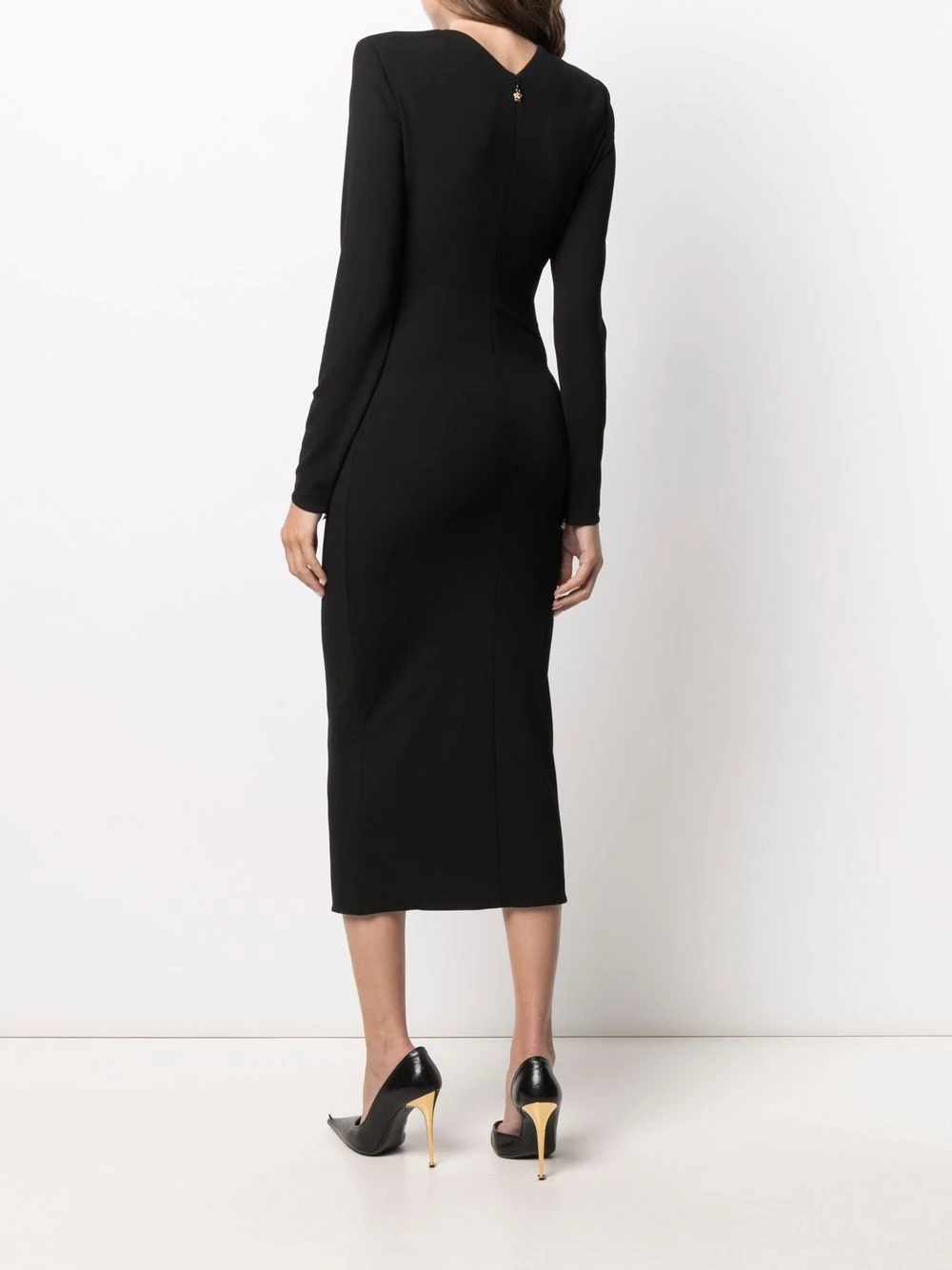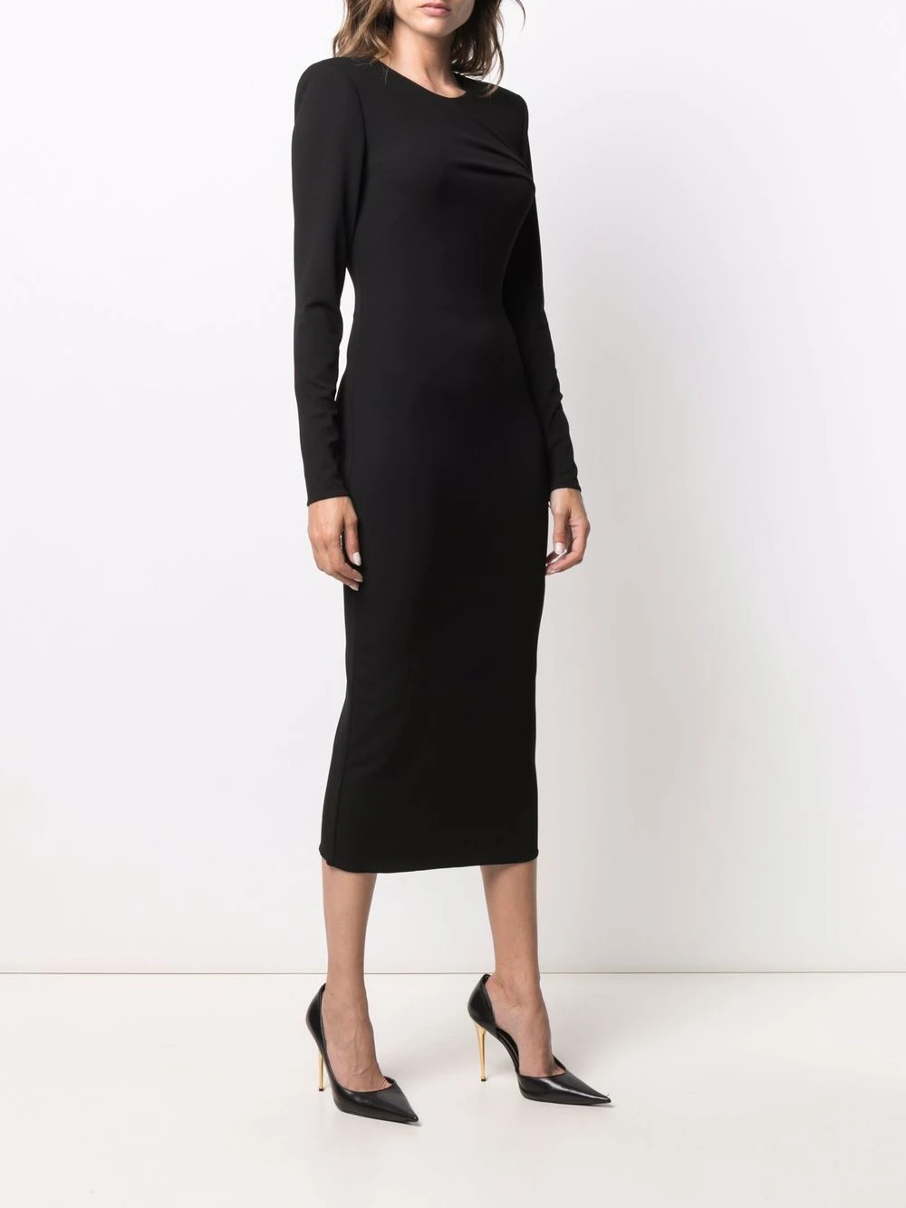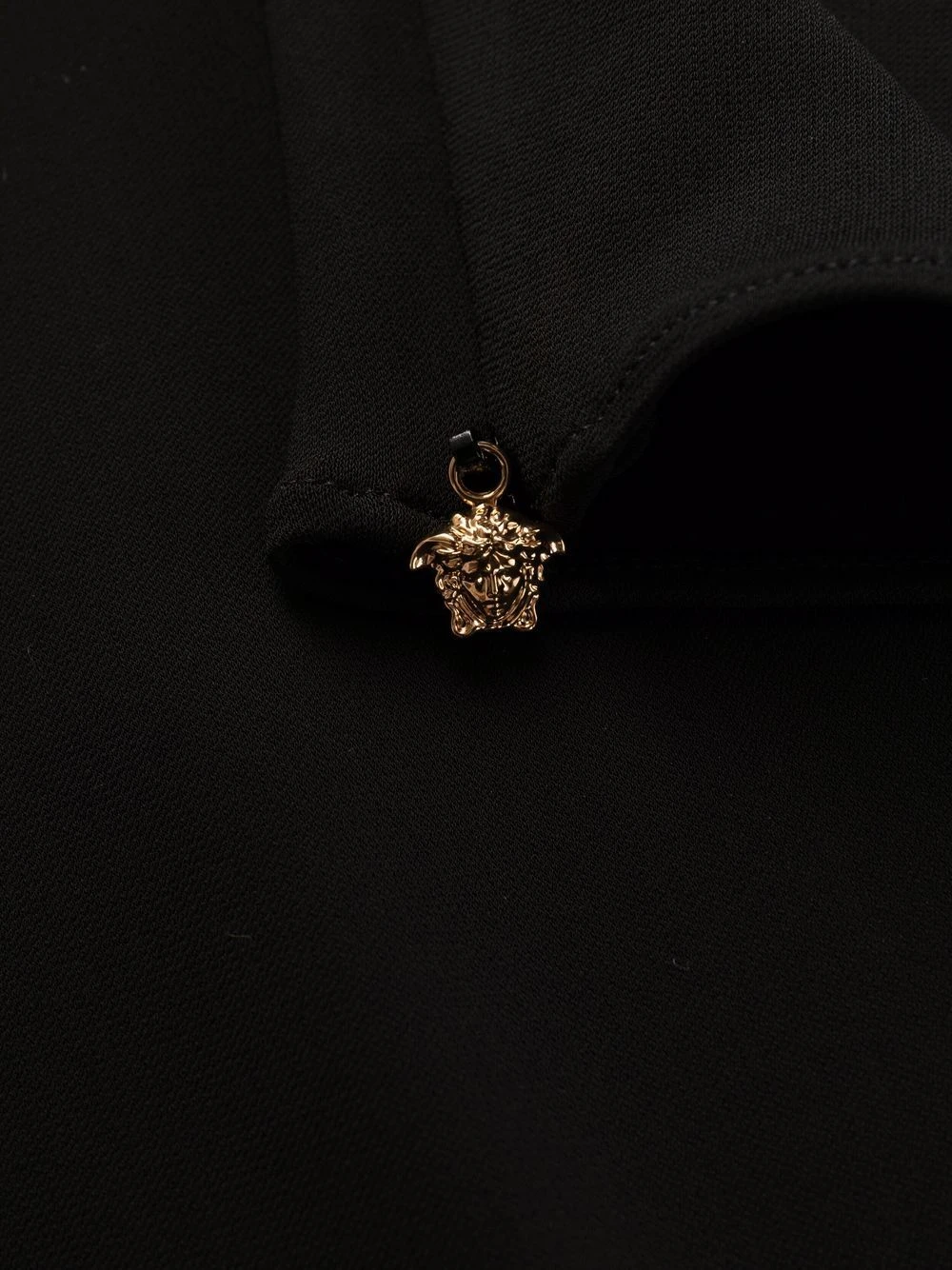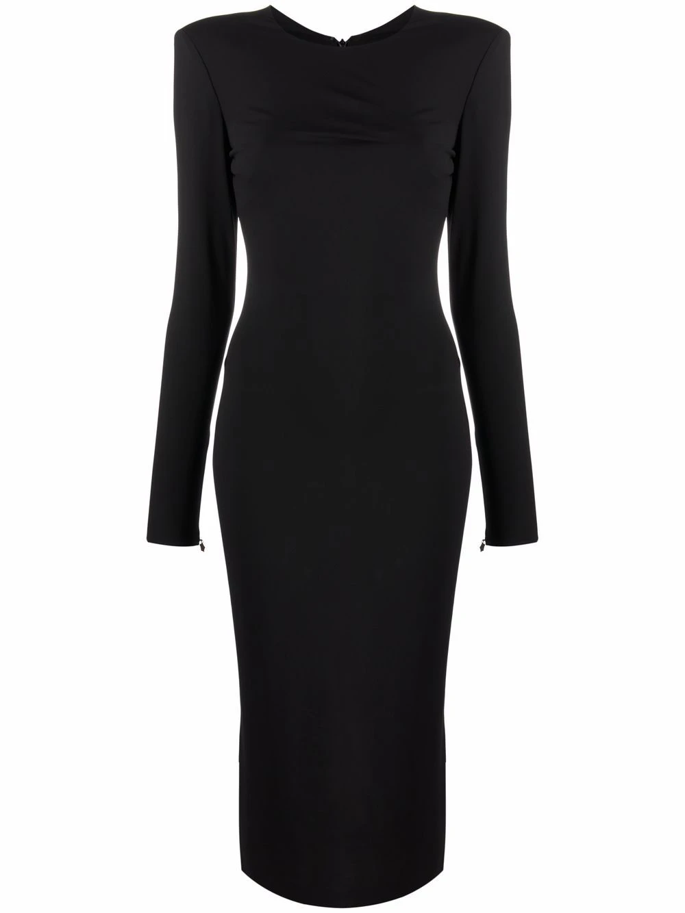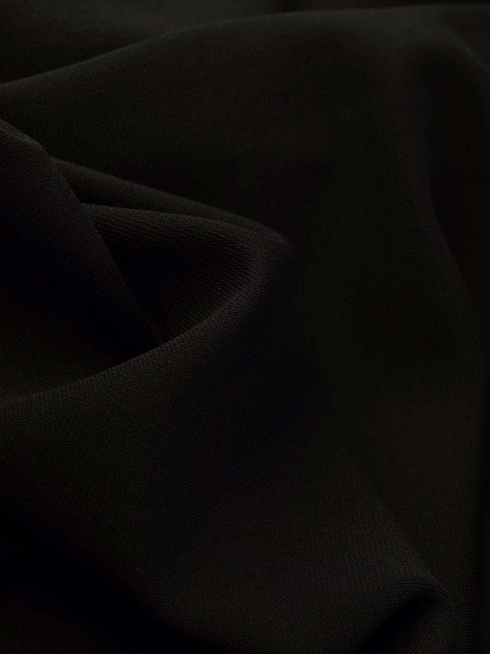 Détails de fronces, encolure ronde, épaulettes, manches longues, poignets zippés, fermeture zippée dissimulée à l’arrière, coupe mi-longue. Couleur : noir.