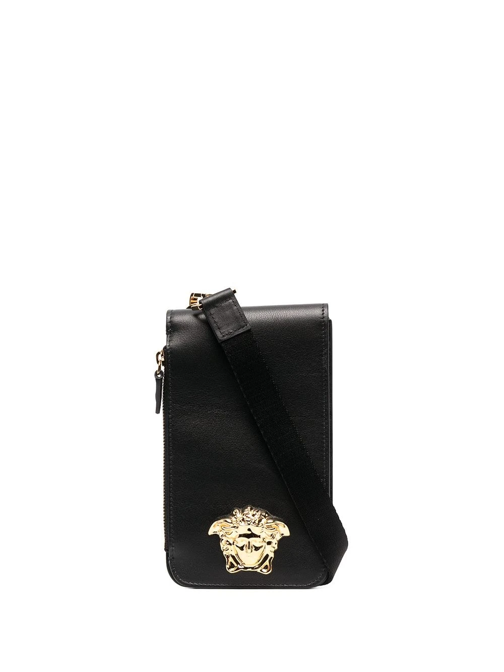 Motif Medusa, finitions en métal doré, bride portée épaule détachable, compartiments intérieurs pour carte. Couleur : Noir. Matière : cuir de veau.