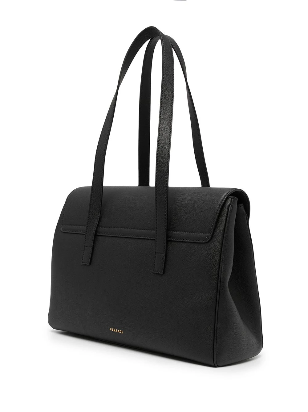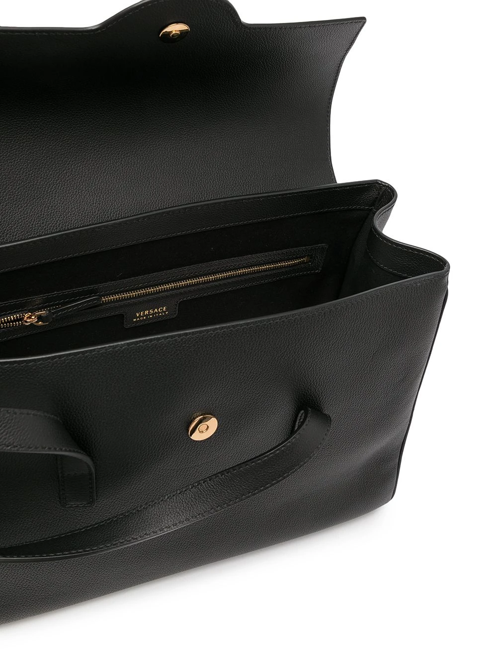 Détail Medusa, deux longues anses sur le dessus, rabat sur le devant, fermeture magnétique, poches intérieures zippées. Couleur : noir. Matière : cuir.