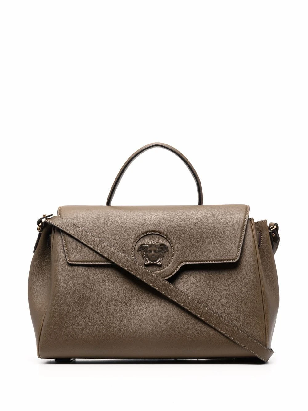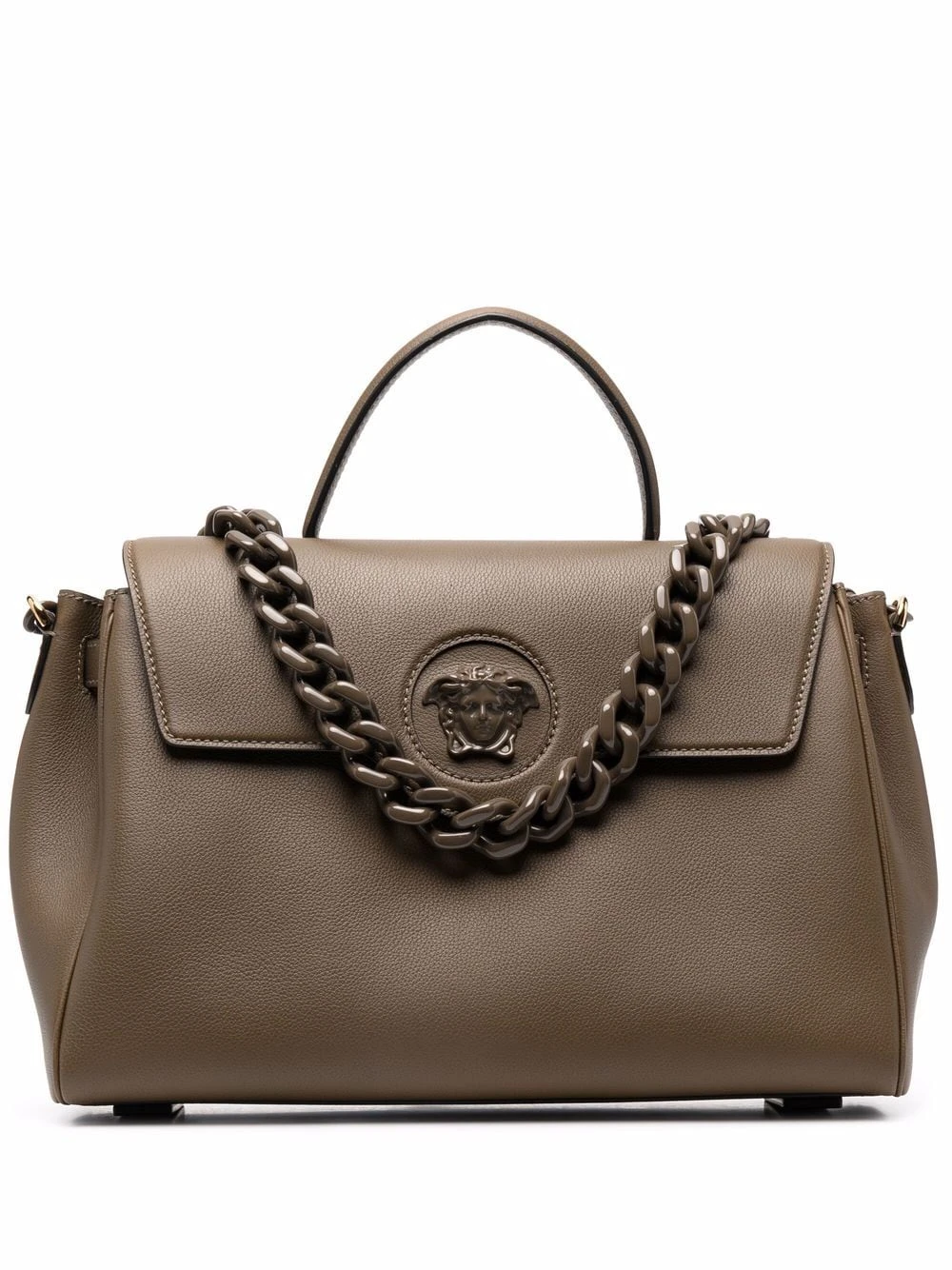 Motif Medusa, logo doré, détails de chaînes, anse arrondie, bride porté épaule détachable, rabat sur le dessus à fermeture magnétique. Matière : cuir.